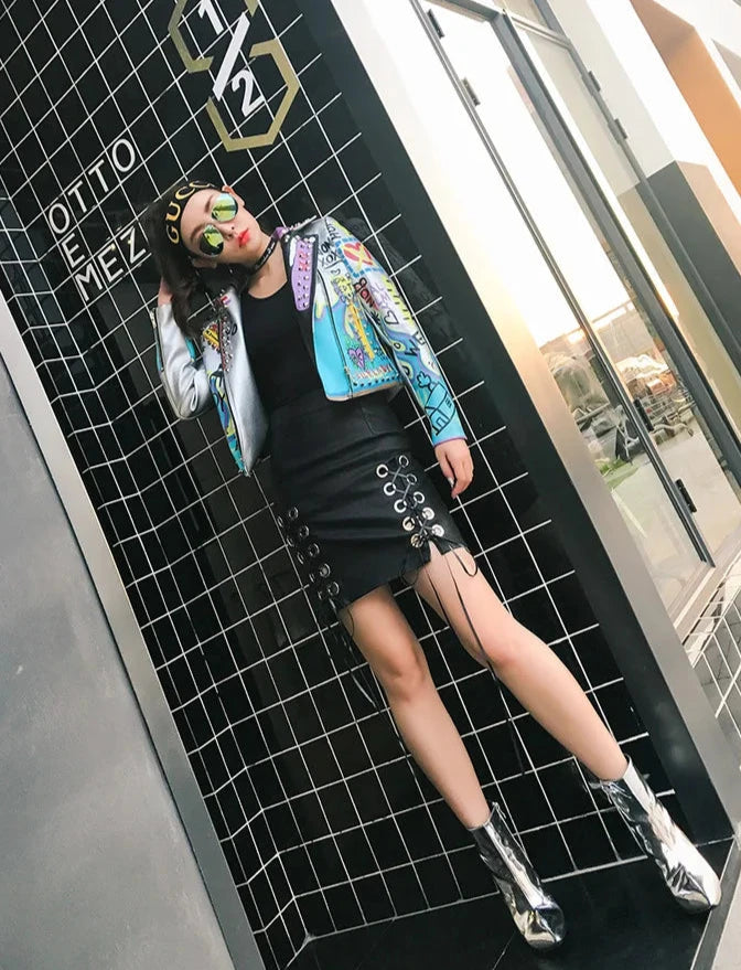 Introducing the Feeling Alive Tonight Jacket - the ultimate statement piece for the confident and daring. Crafted with high-quality PU material, this jacket features a stylish zipper closure and unique decorative elements such as rivets and murals. Its adjustable waist adds versatility to your look. Be bold, be alive, be you!