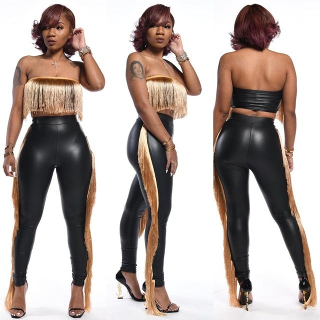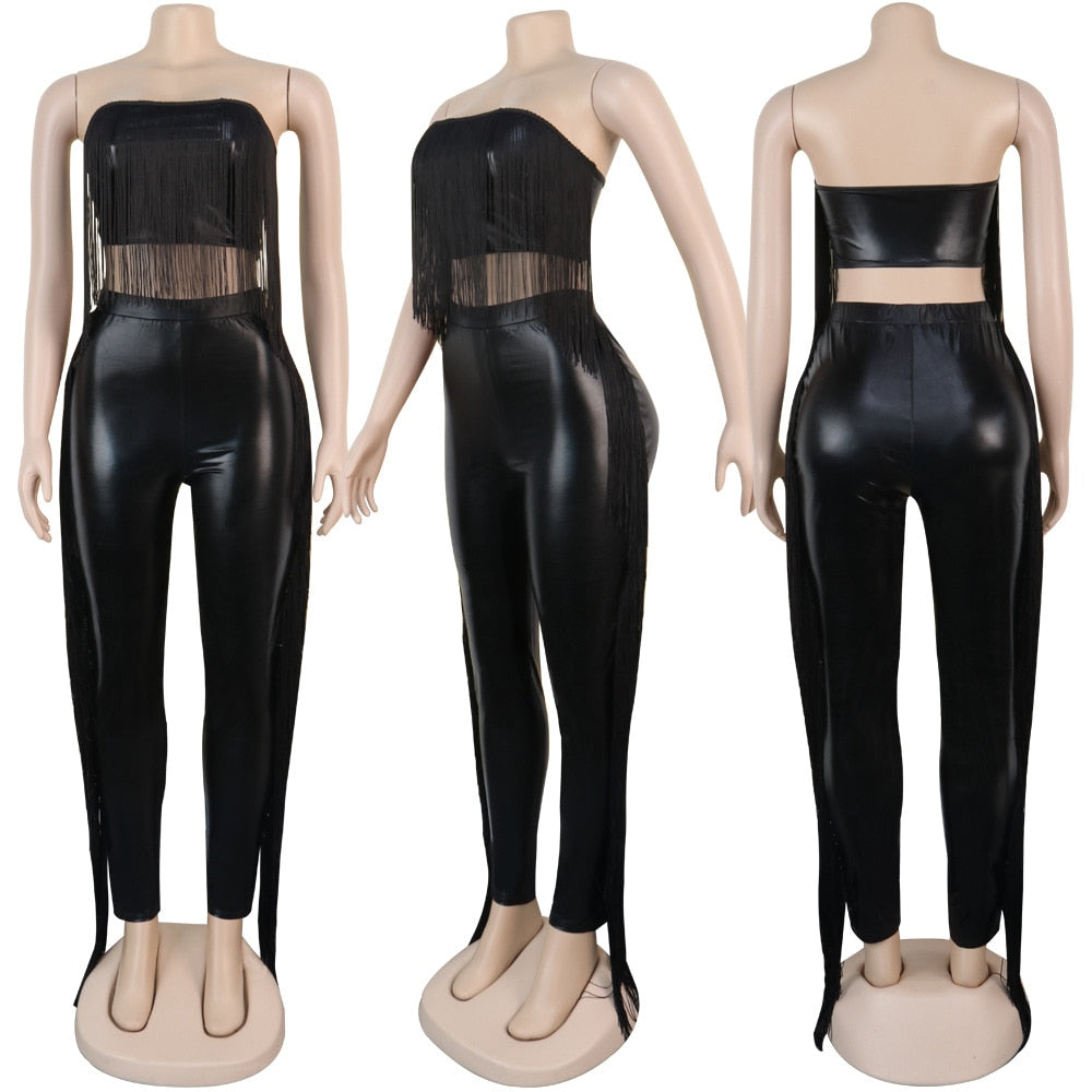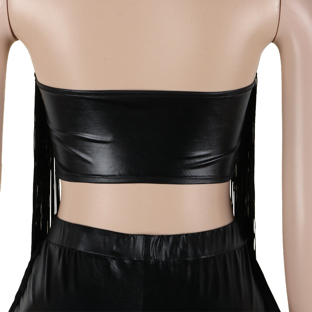 Faux Leather PU Polyester Tassel Decoration Sleeveless Pant Sets
