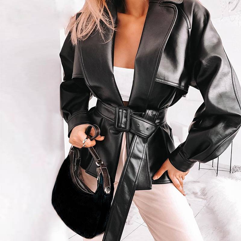 Faux Leather on Single Button Turn-down Collar Black Jackets