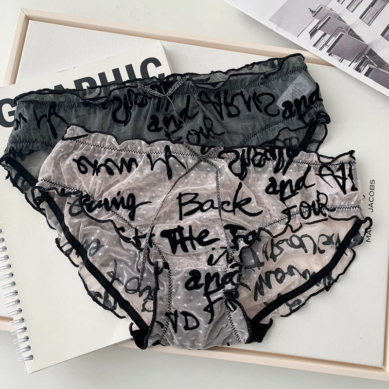 Letter Printed Mesh Briefs with Ruffle Decoration and Nylon Material