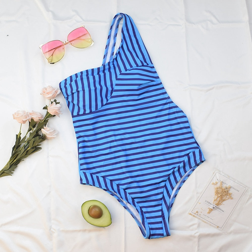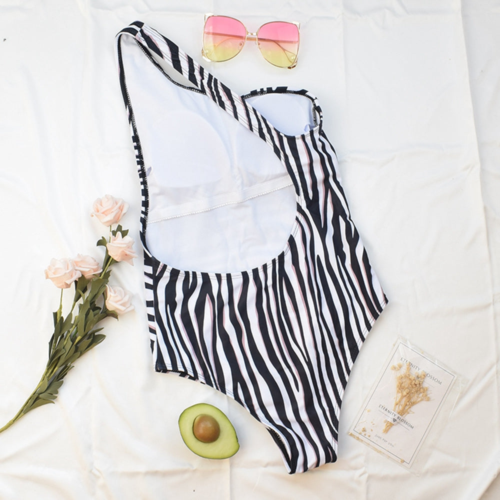One-Shoulder Polyester Spandex One-Piece Swimsuit with Stripe and Zebra Pattern