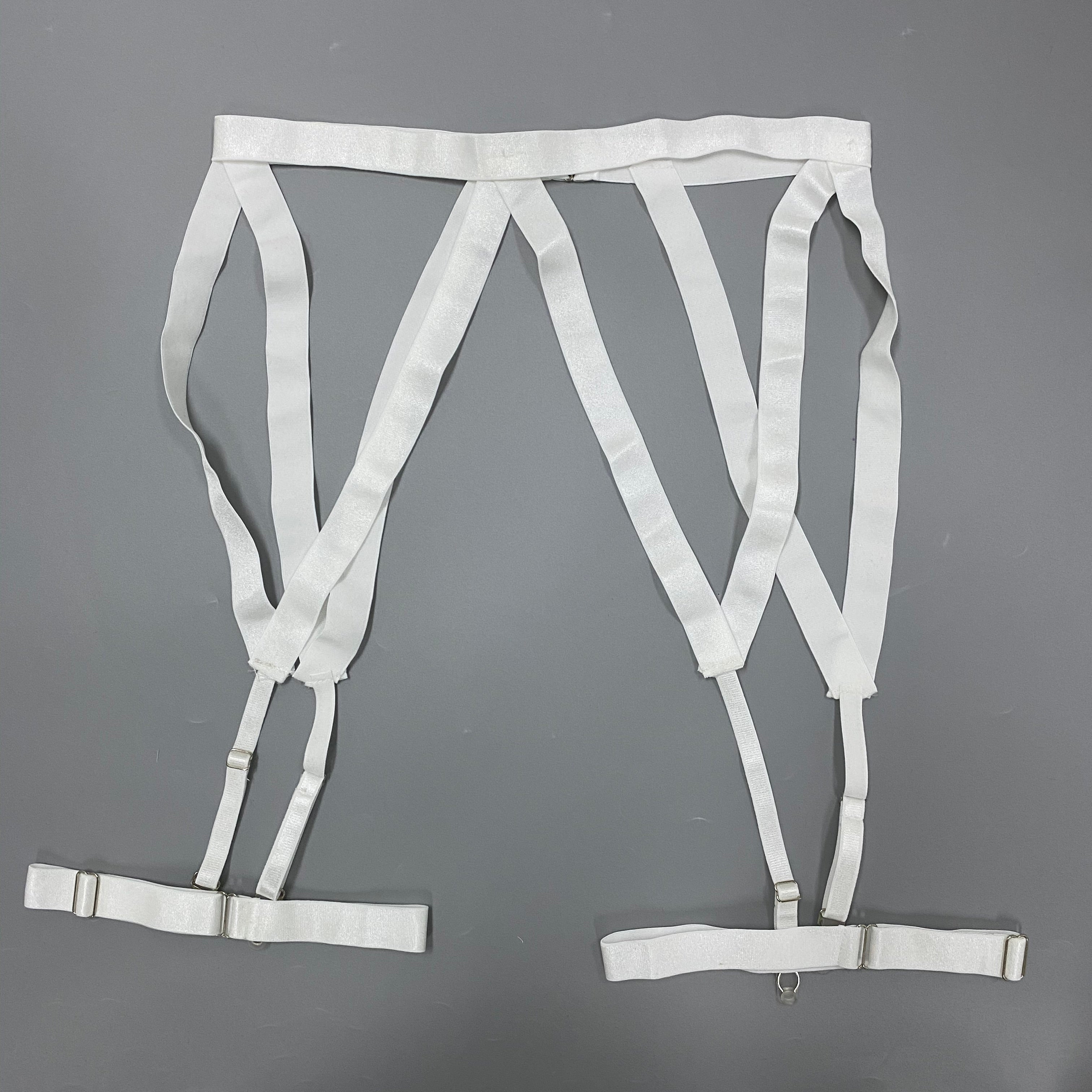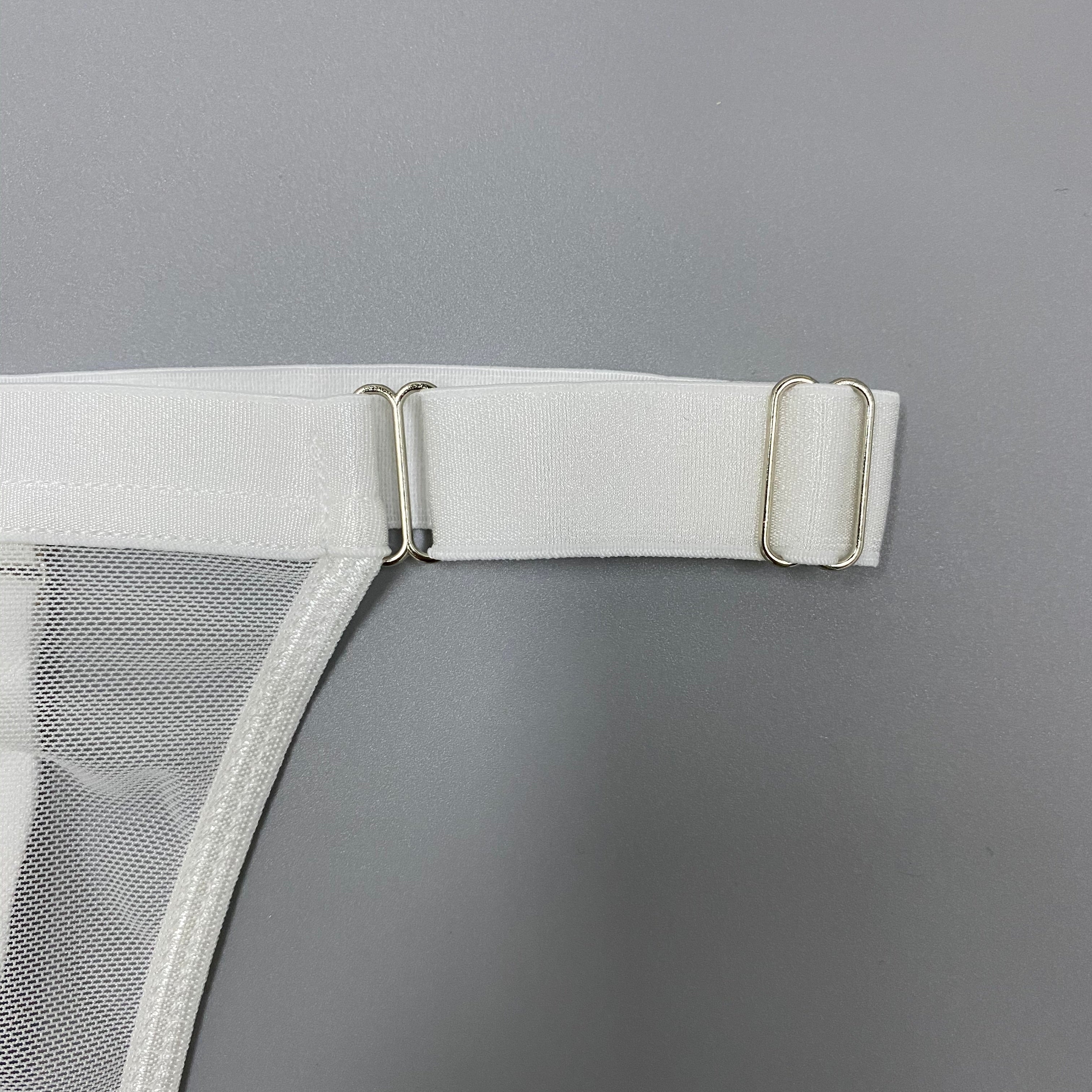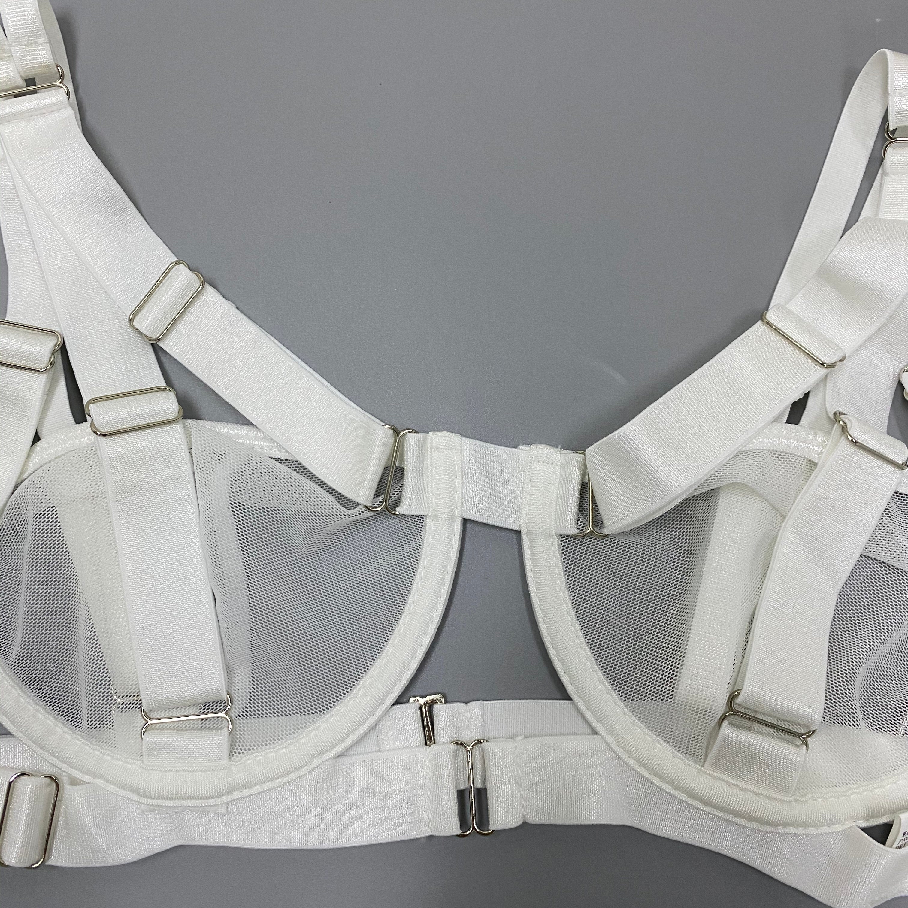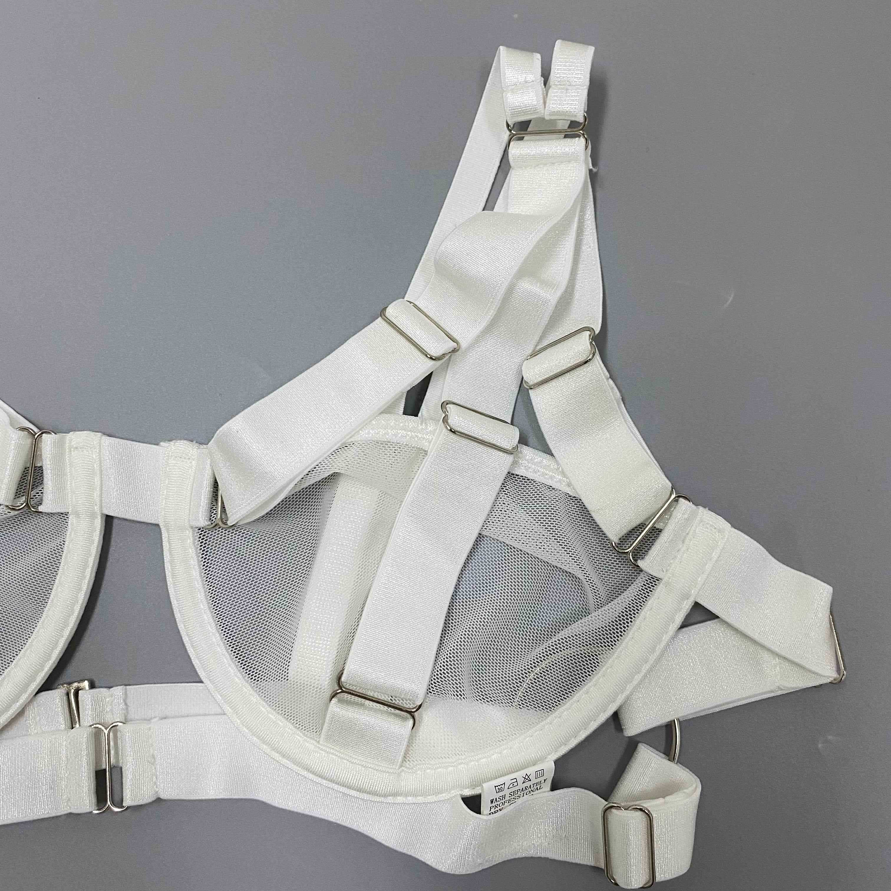 If you like sexy and edgy lingerie, then this set is for you. Made of see-through white polyester, the solid strap design is complete with a collar and garter belt. Designed to make you feel confident and sexy, this set is sure to complement any outfit. The underwired cup design is perfect for all-day wear.