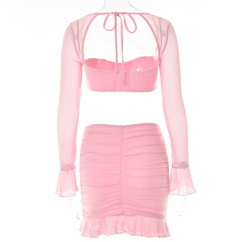 A women's skirt set is a classic and stylish choice. Made of cotton, it is lightweight and comfortable. It has a ruffled decoration and comes in two colors, pink and black.