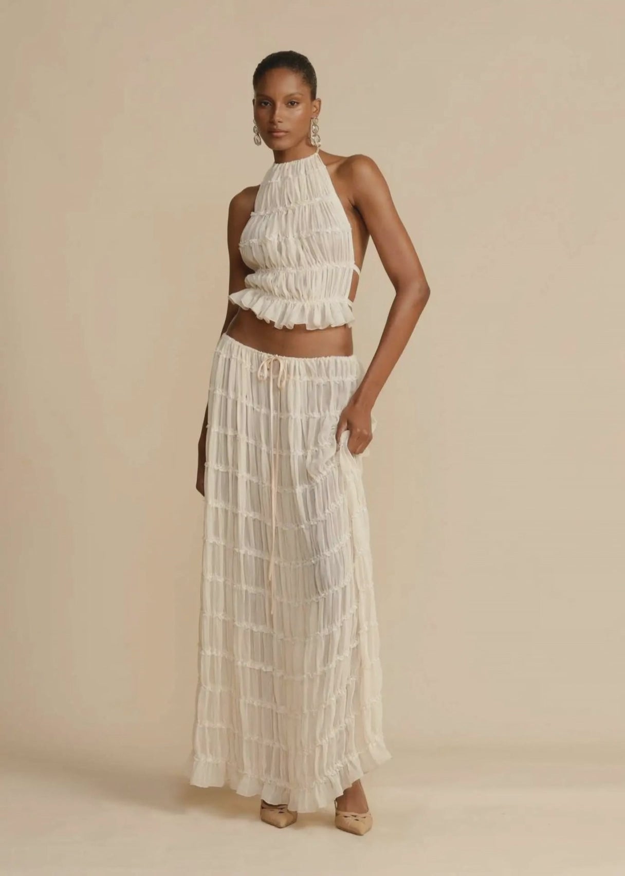 Sheer Lace Up Ruched Skirt Set