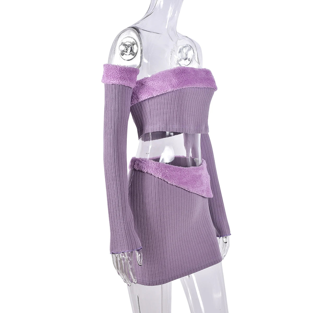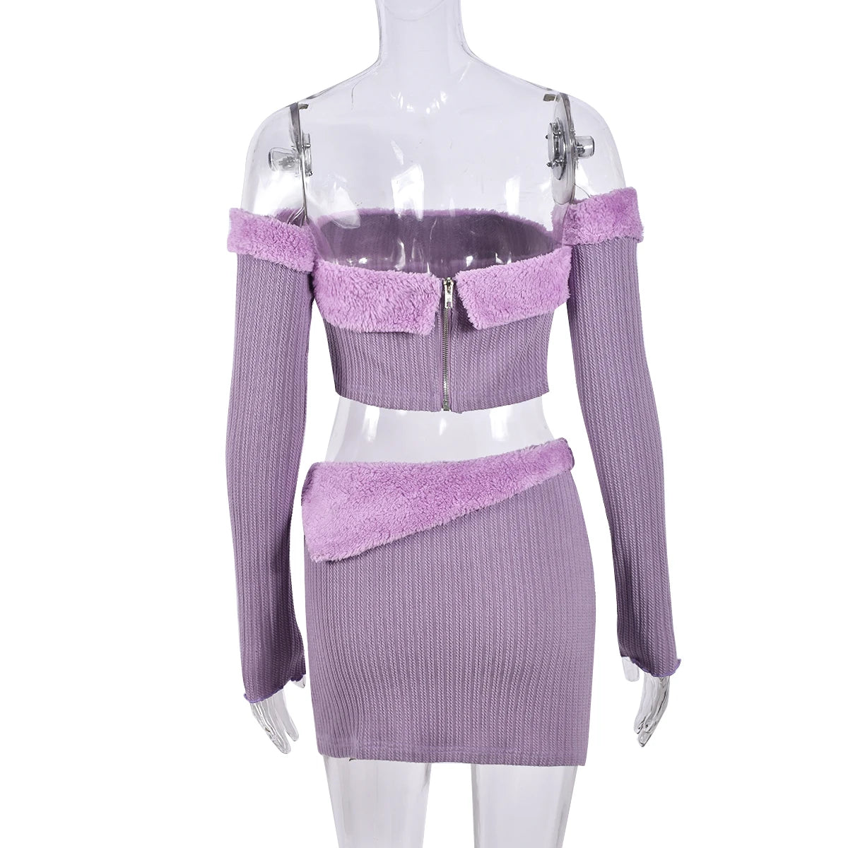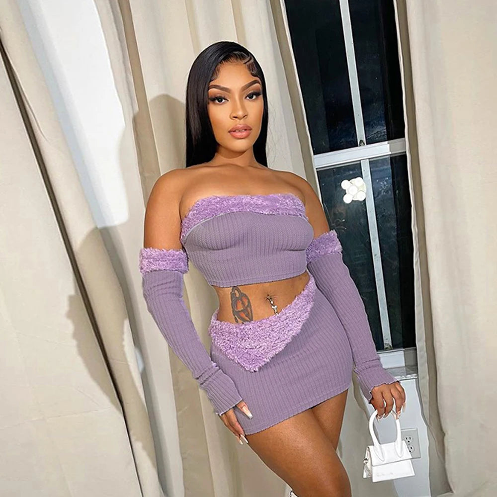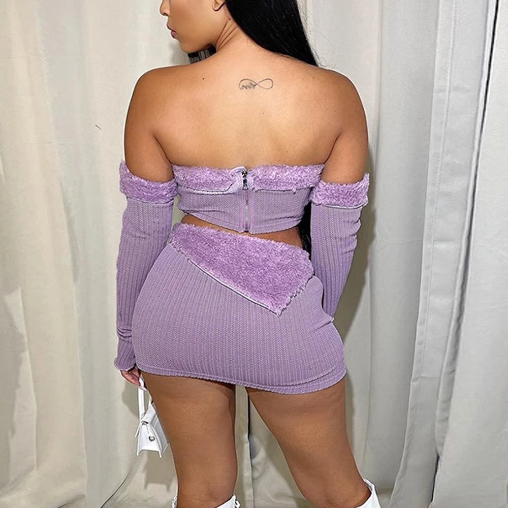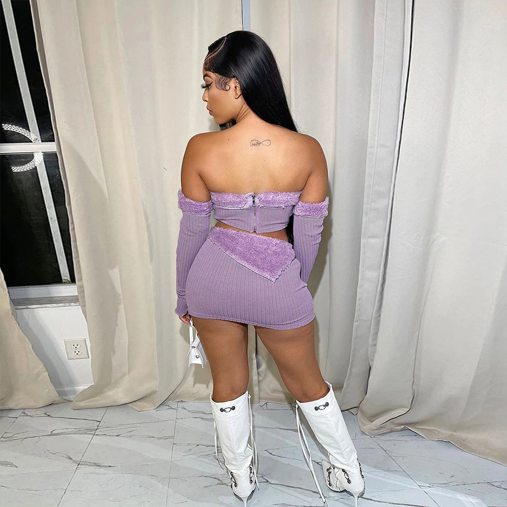 This Who's So Disconnected skirt and top set offers an elegant silhouette with a slash neck, regular sleeves, and above-the-knee length. Crafted from knitted fabric with a soft blend of cotton and polyester, the set features stylish patchwork for a unique finish. A perfect combination of comfort and style.