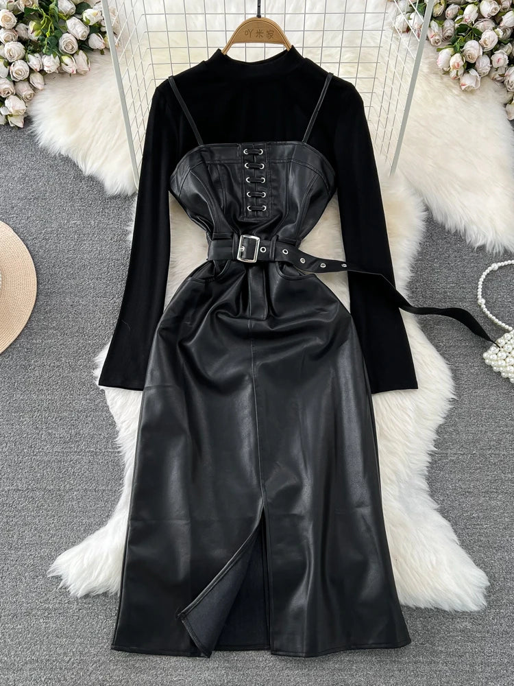 Experience the ultimate in sophistication and elegance with our Closer To Fantasy Midi Dress Set. Made with luxurious faux leather and soft, wrinkle-resistant polyester, this dress is both comfortable and stylish. Feel confident and glamorous in this stunning dress set!