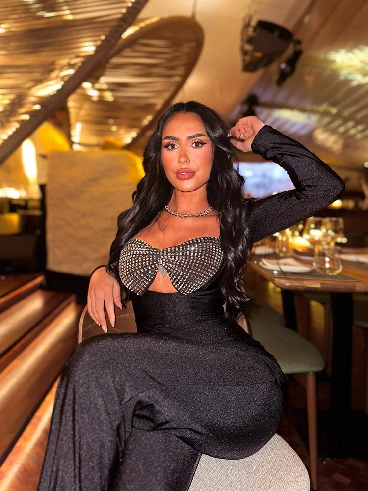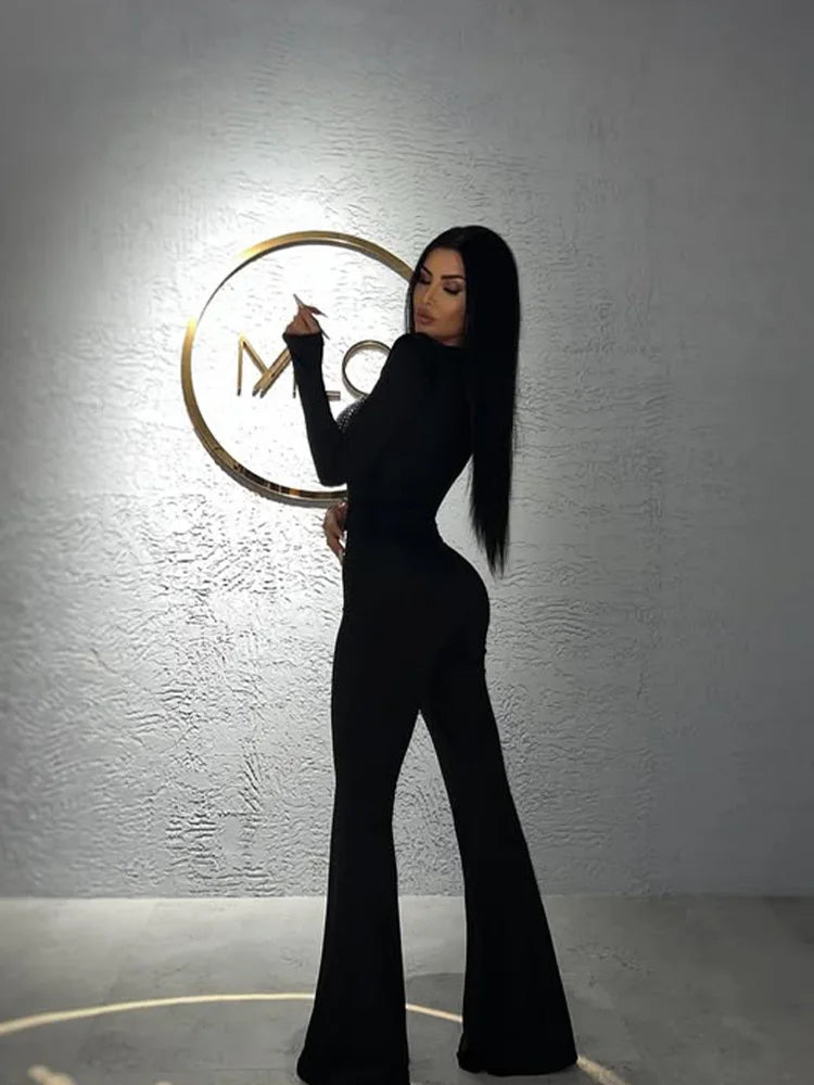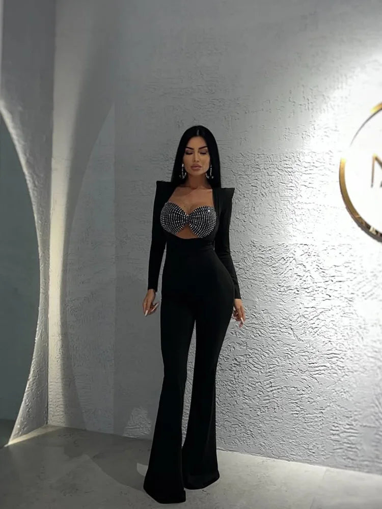 Ignite the room in this electrifying jumpsuit that sparkles with unapologetic glamour. Adorned with shimmering rhinestones and daring hollow-out cutouts, this piece merges edge with elegance in a way that refuses to be ignored. Every movement catches the light, every detail screams confidence. Built for those who thrive in the spotlight and aren't afraid to let their boldness shine through—literally.