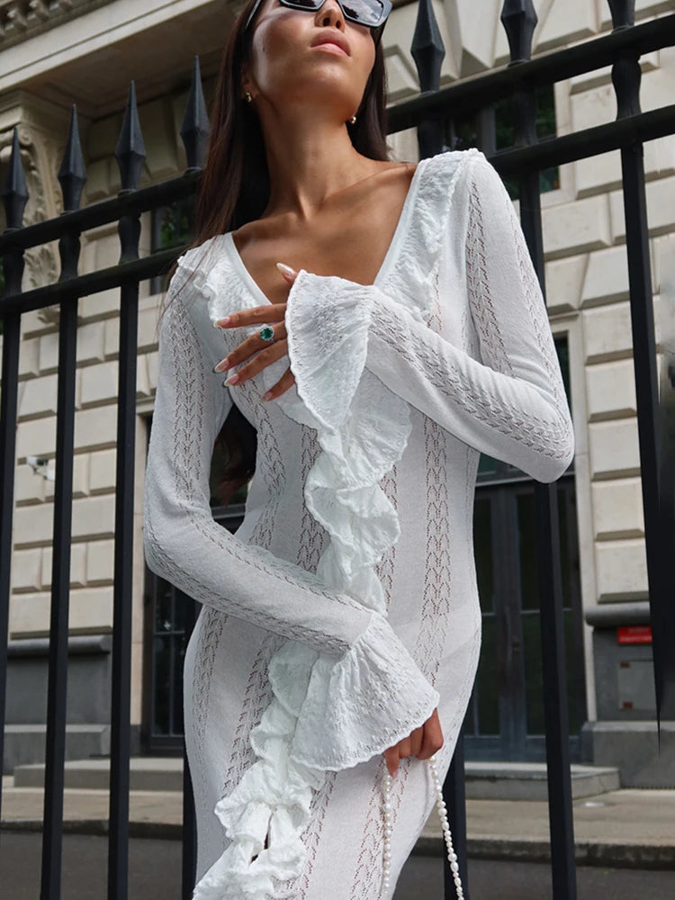 Get ready to make a statement with our Time to Show It Off Maxi Dress! The sheath silhouette and V-neckline flatter your figure while the hollow out and ruffle details add a touch of sexiness. Made of high-quality polyester, this ankle-length dress is perfect for a night out at the club. Show off your style with confidence!