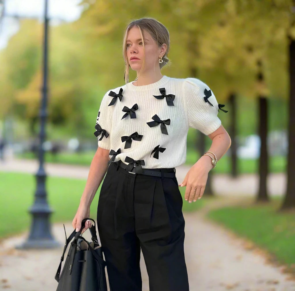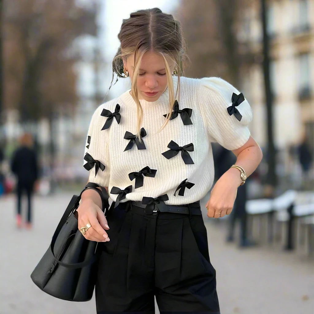 Add a touch of elegance to any outfit with our Whispering Pines Sweater. The short length flatters any figure, while the polyester material provides comfort and durability. A decorative bow and O-neck collar add delicate details. The medium stretch and puff sleeve style offers both comfort and style.
