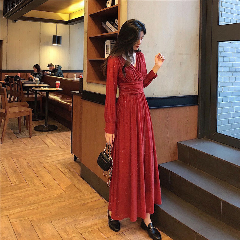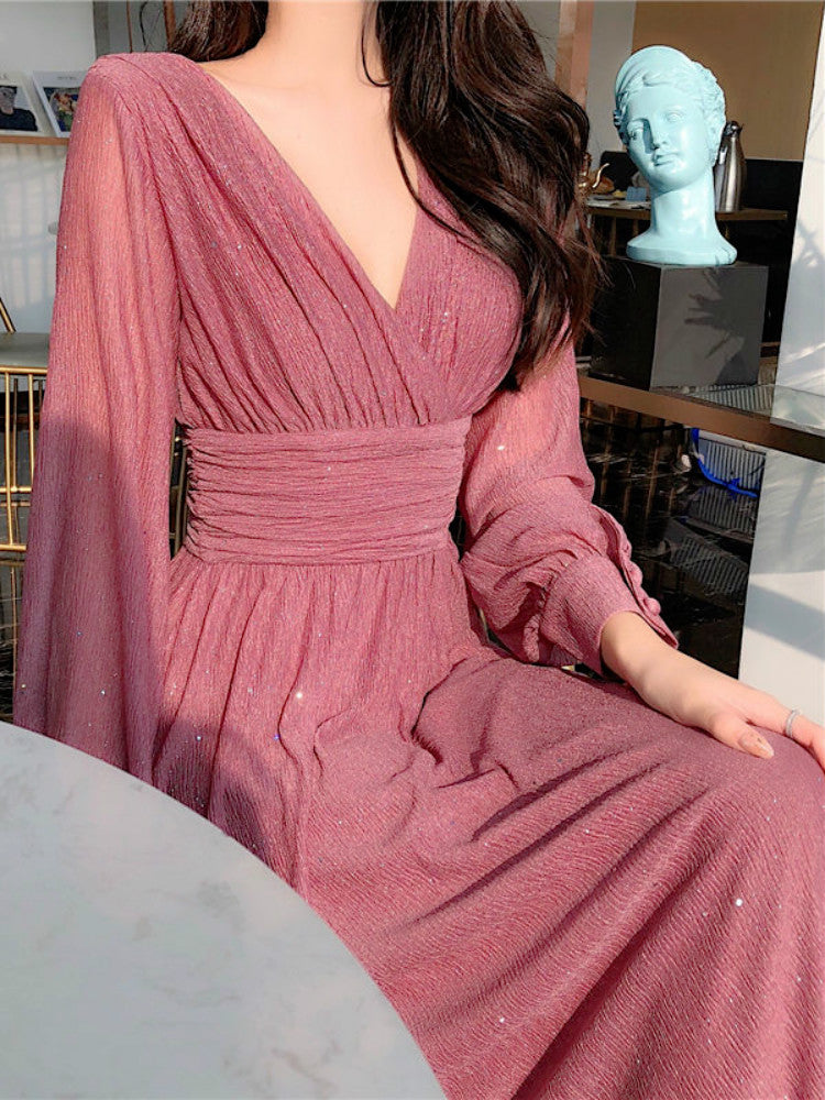 Dress for any occasion with this light, flowy dress. The polyester fabric is breathable and lightweight, perfect for warmer days. The pleated design adds a stylish touch to the A-line silhouette. The lantern full sleeve has a v-neck, so you can show off your beautiful collarbone.