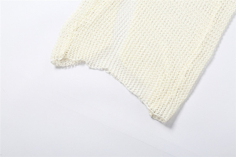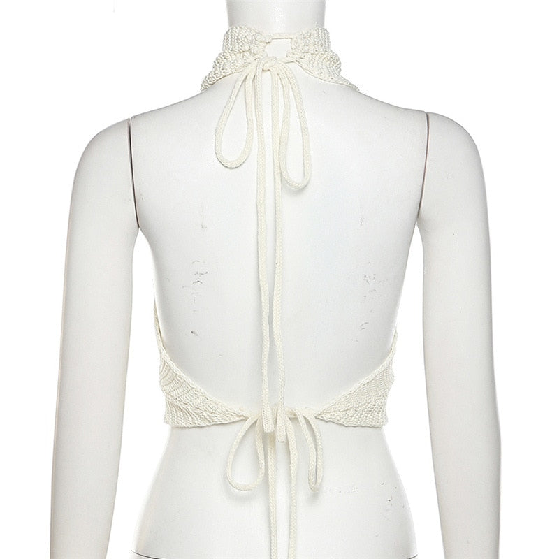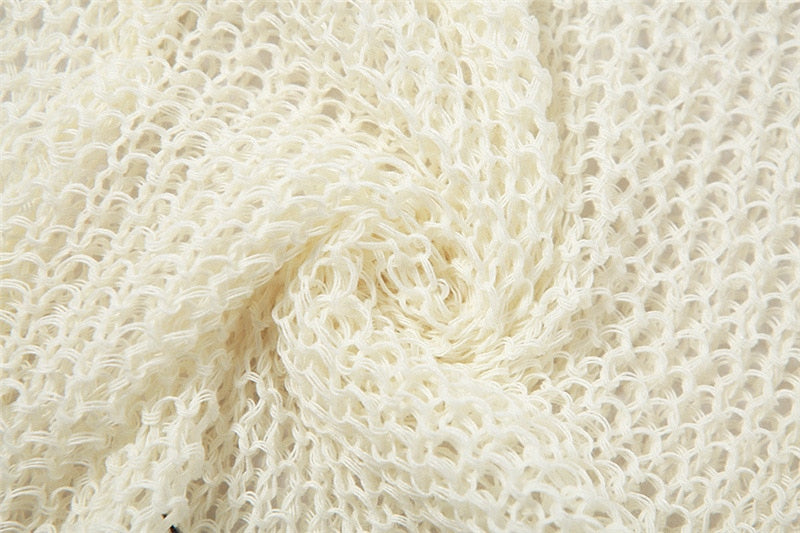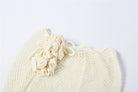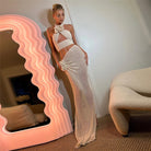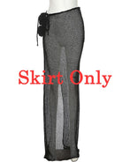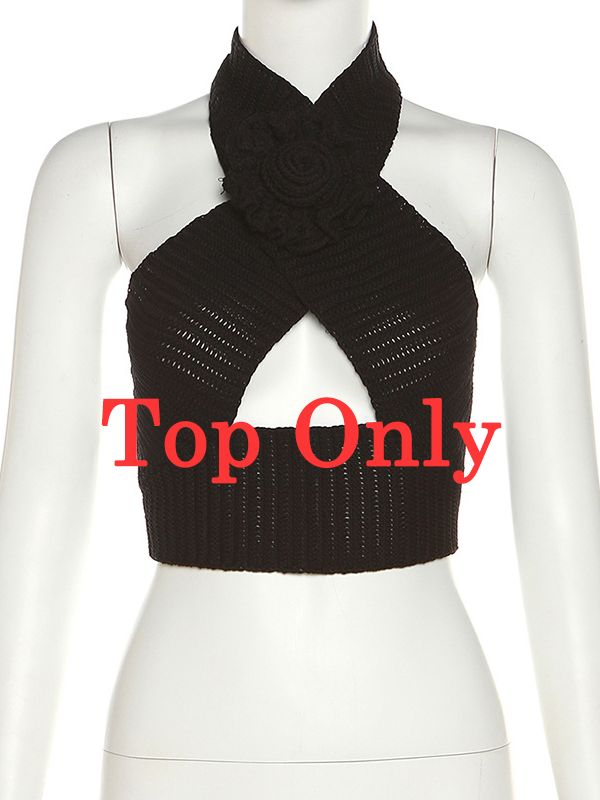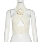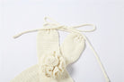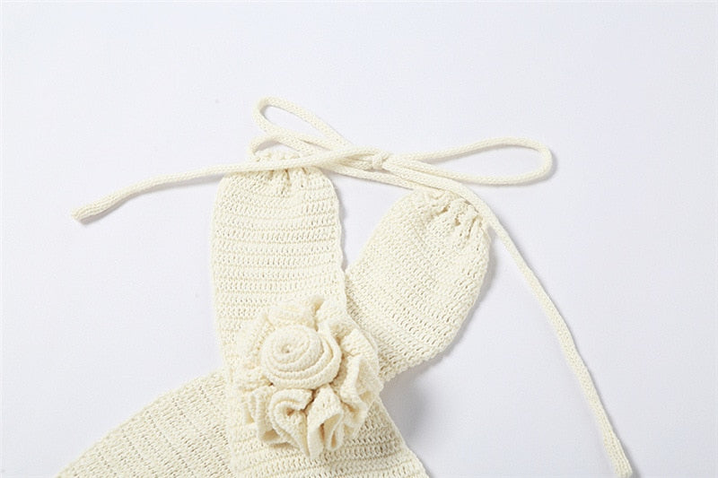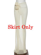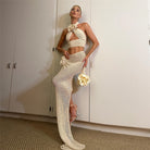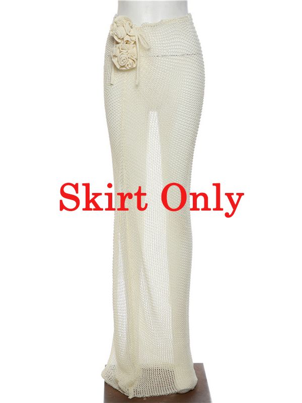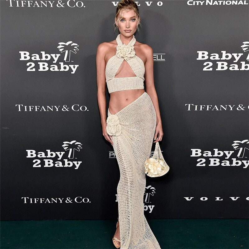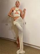 This two-piece top and skirt set crafted from beige-knitted fabric features a wrap-style crop top and a long sarong-style skirt, complemented by floral appliqués. A unique and modern look, while maintaining a sophisticated and timeless style. Perfect for special occasions and events when you want to make an impact.