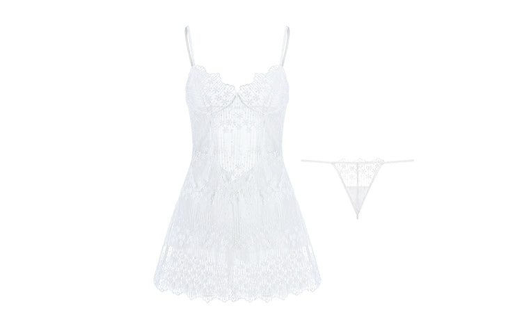 This lace nightdress is the perfect combination of sexy and cute. The nightdress is made of lace, which is breathable and light, perfect for summer nights. The spaghetti straps provide an elegant touch to the simple design. The floral pattern is a sweet addition to the dress.