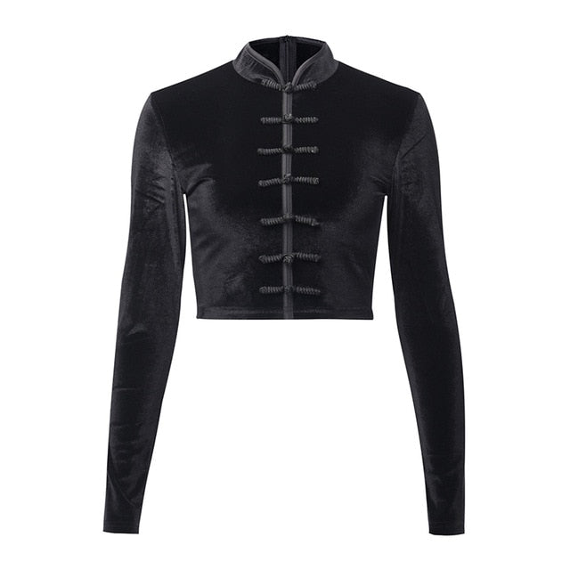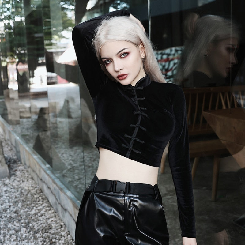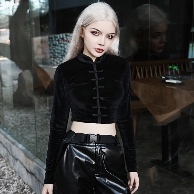 Goth Mandarin Collar with Spandex Polyester Material and Velour Fabric Crop Top