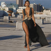 Sleeveless A-Line Long Dress with High Slit and Floral Lace Applique