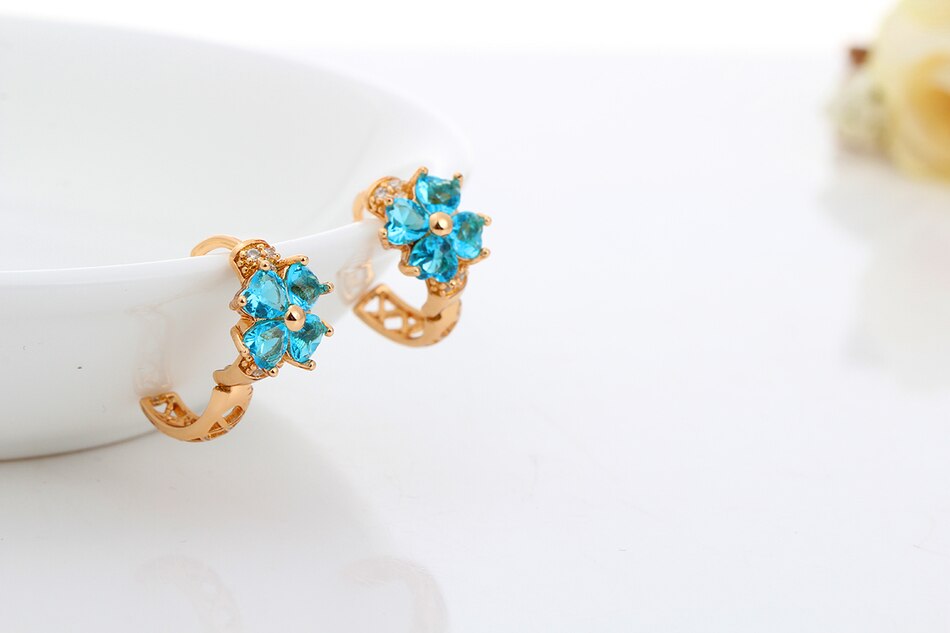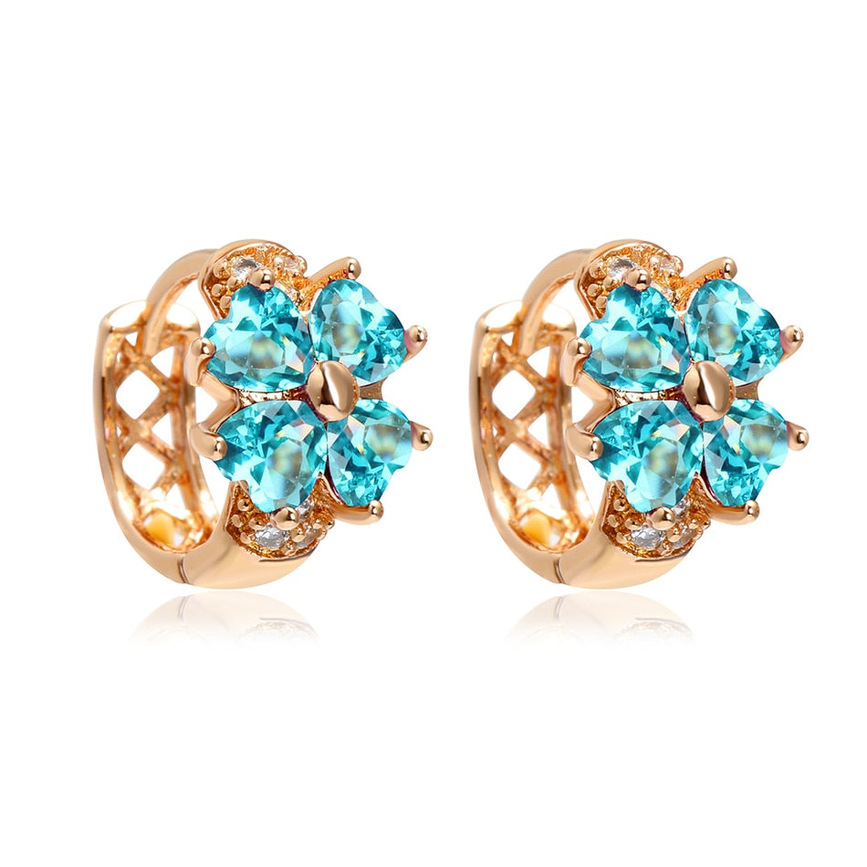 Blue Crystal Lucky Four Leaf Clover Heart Cut Small Hoop Earrings