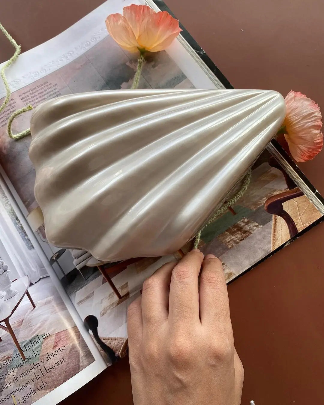 Spark joy in your wardrobe with our Whirling Elegance Clutch Bag! Crafted from high-quality plastic, its solid pattern and unique shell shape make a statement. Complete with a delicate chain decoration, this bag adds a touch of elegance to any outfit. Perfect for a night out or special occasion.