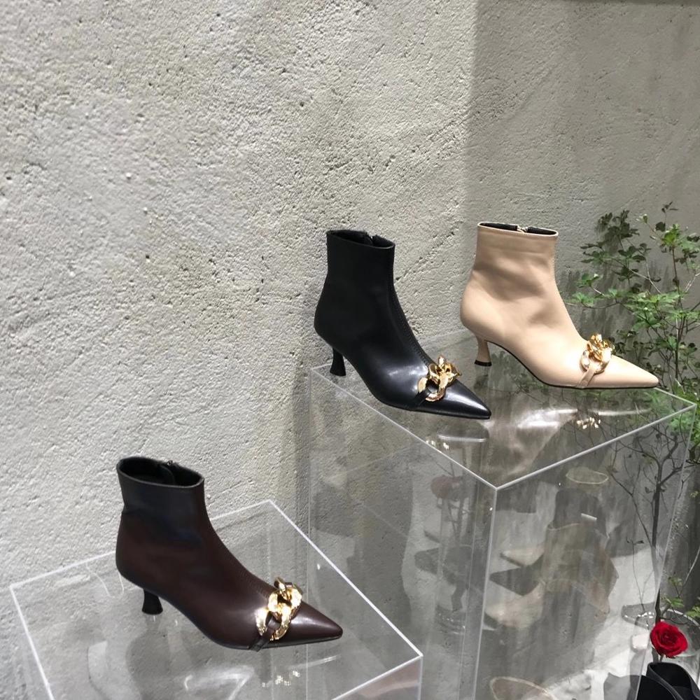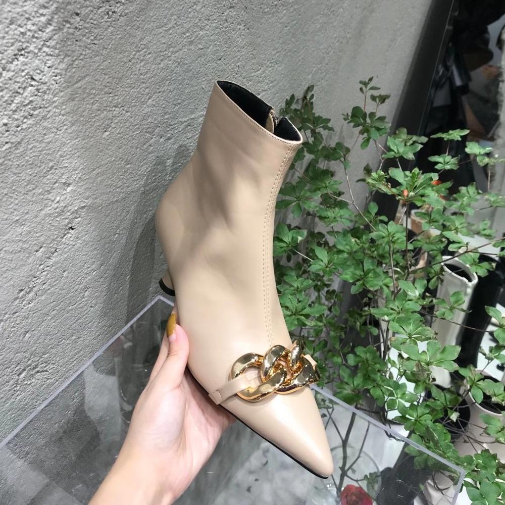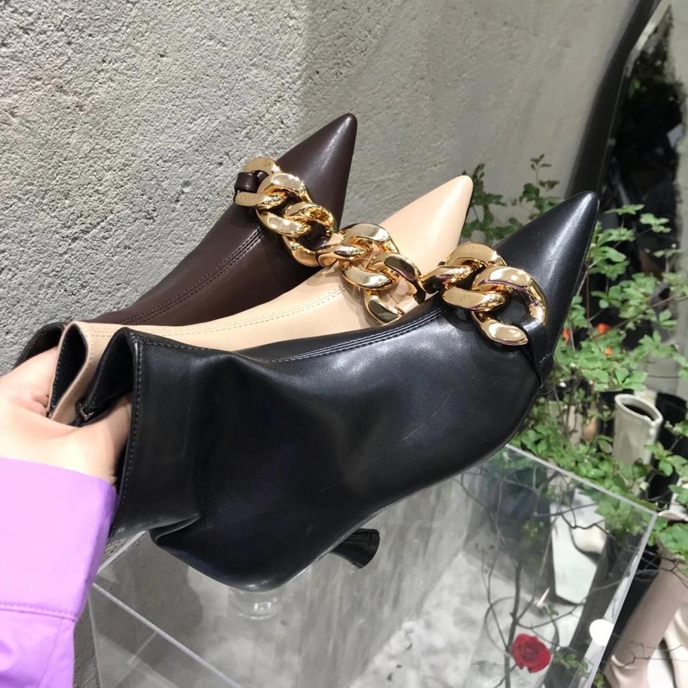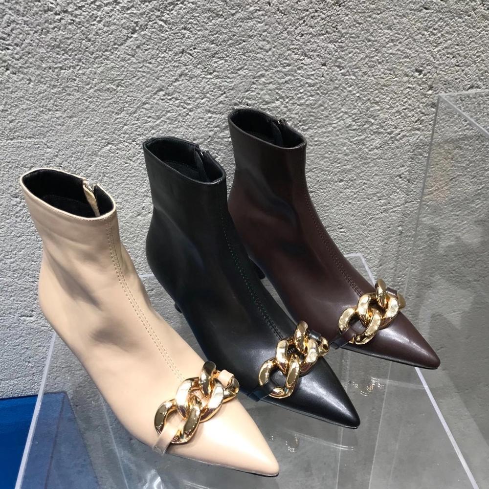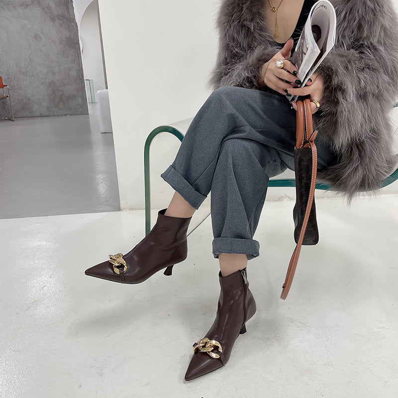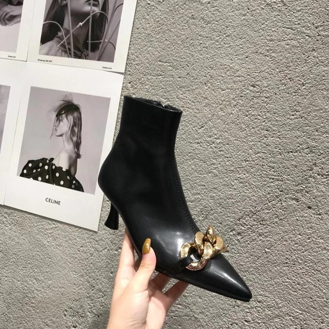 Pointed Toe Ankle Boot with Chain Decoration, Solid Pattern, Zipper Closure, Rubber, and PU Material