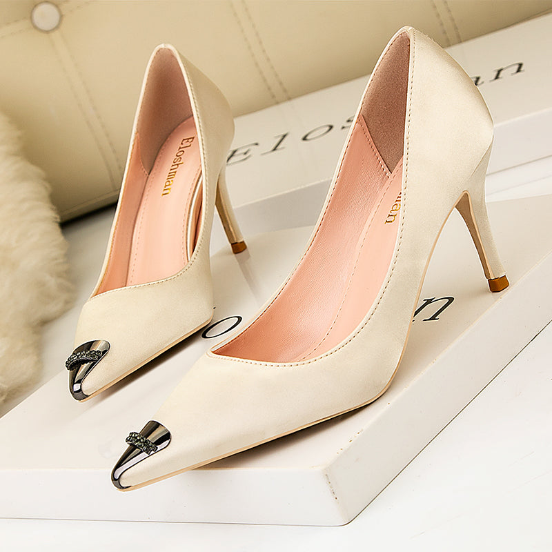 Flock Metal Decoration Pointed Toe Pump Shoes Thin Heels