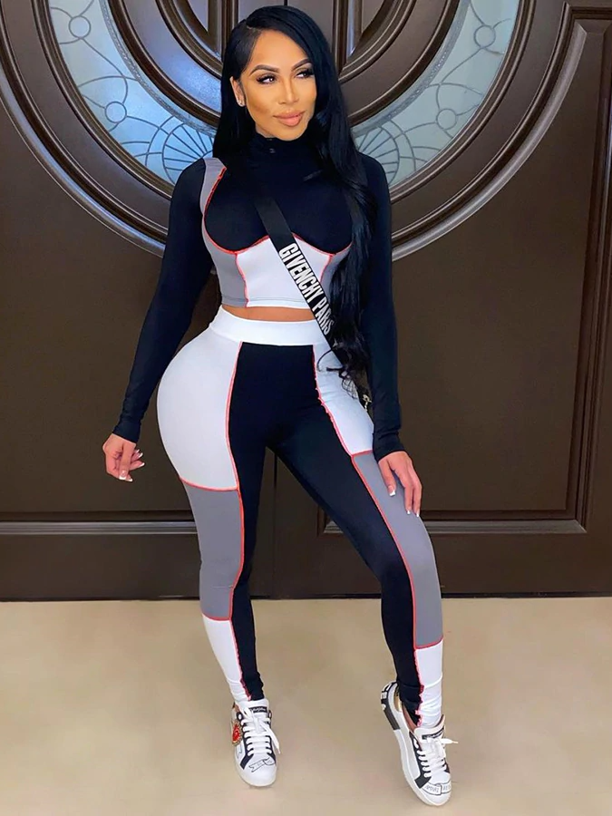 Polyester Spandex Long-Sleeved Crop Top and Elastic Waisted Long Pants Set.