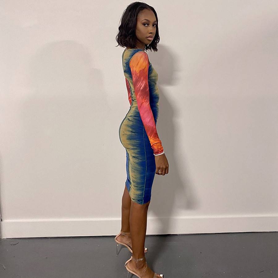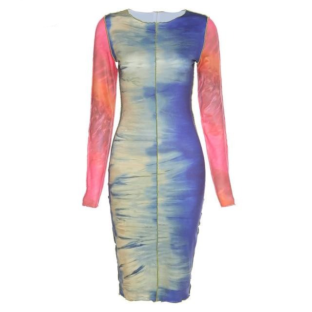 Long-Sleeved Dye Color Midi Dress with O-Neck Collar and Polyester Spandex Material