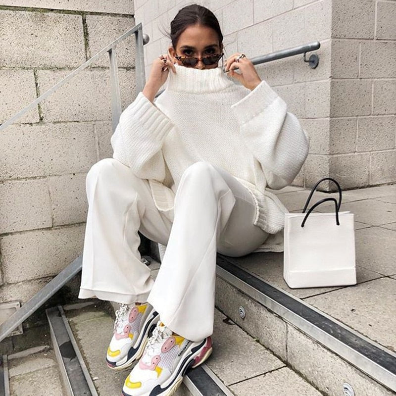 Cotton Polyester Solid Patterned Turtleneck Pullover Oversized Sweater
