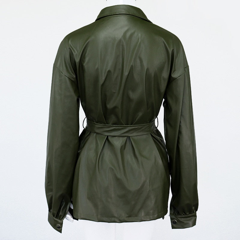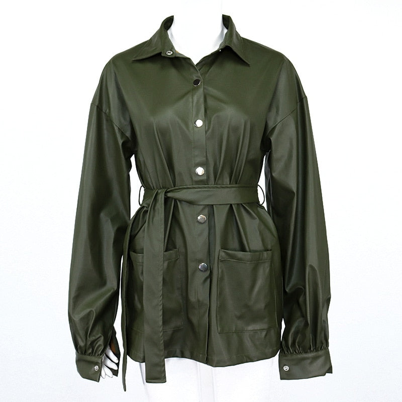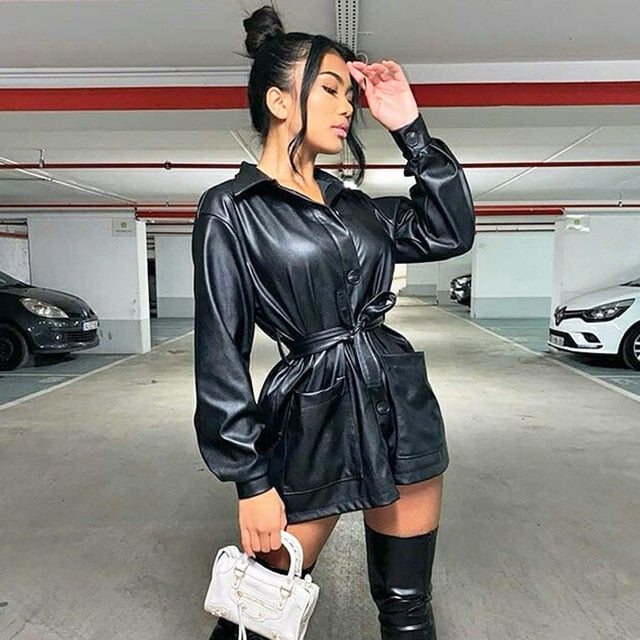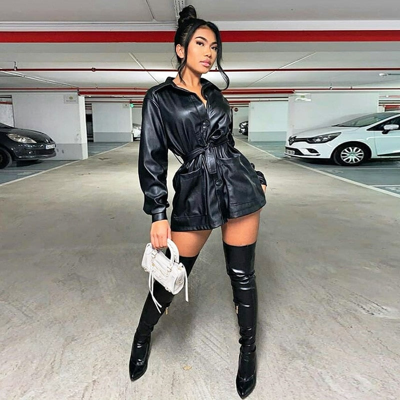 Turn-Down Collared Solid Mini Dress with Long Sleeve, Single-Breasted Closure, Polyester, and PU Material