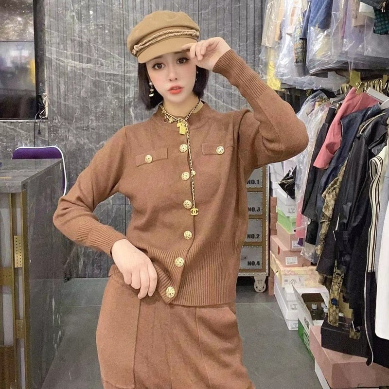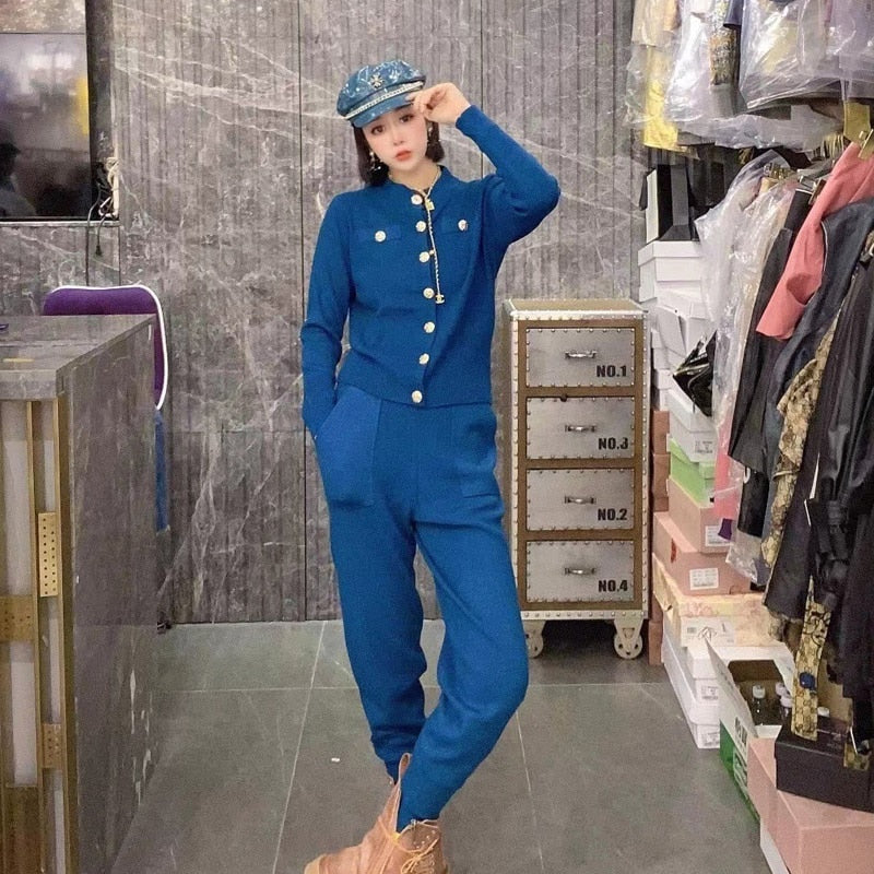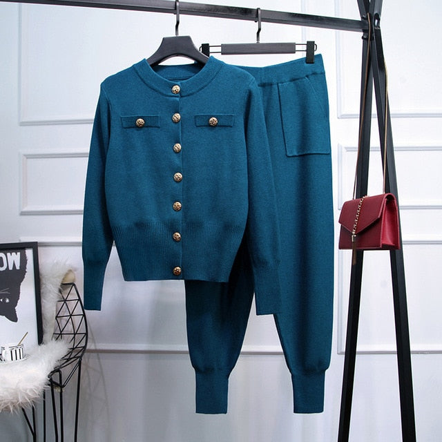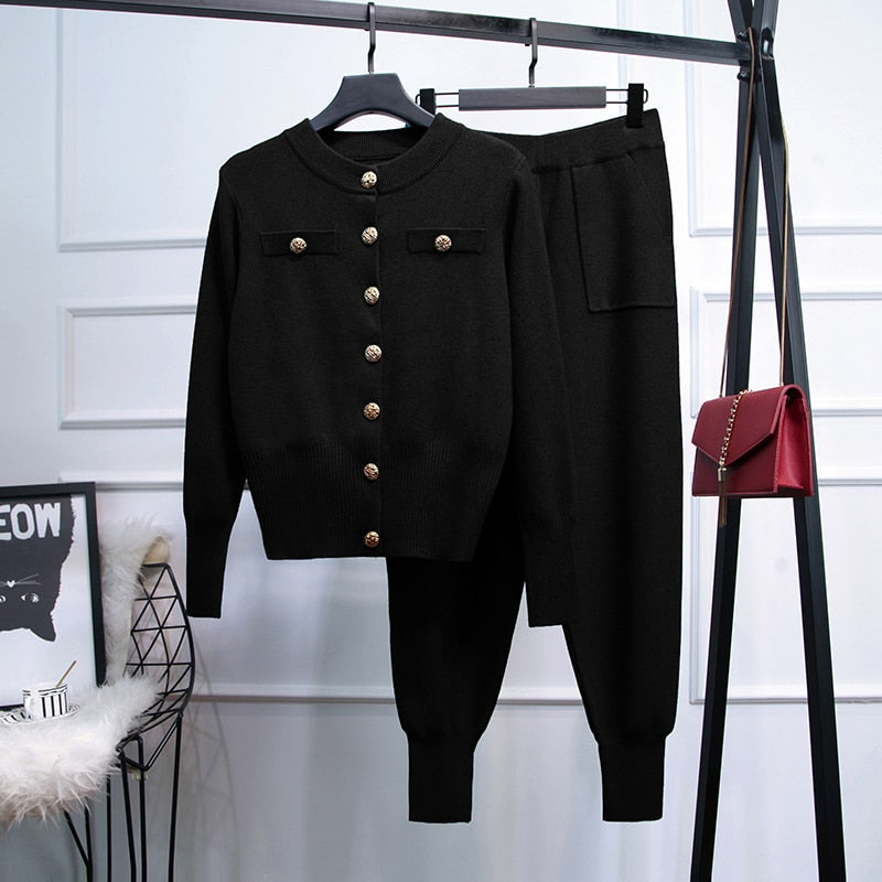 Elastic Waist Pant, O-Neck Collar, and Single-Breasted Closure Sweater with Solid Color