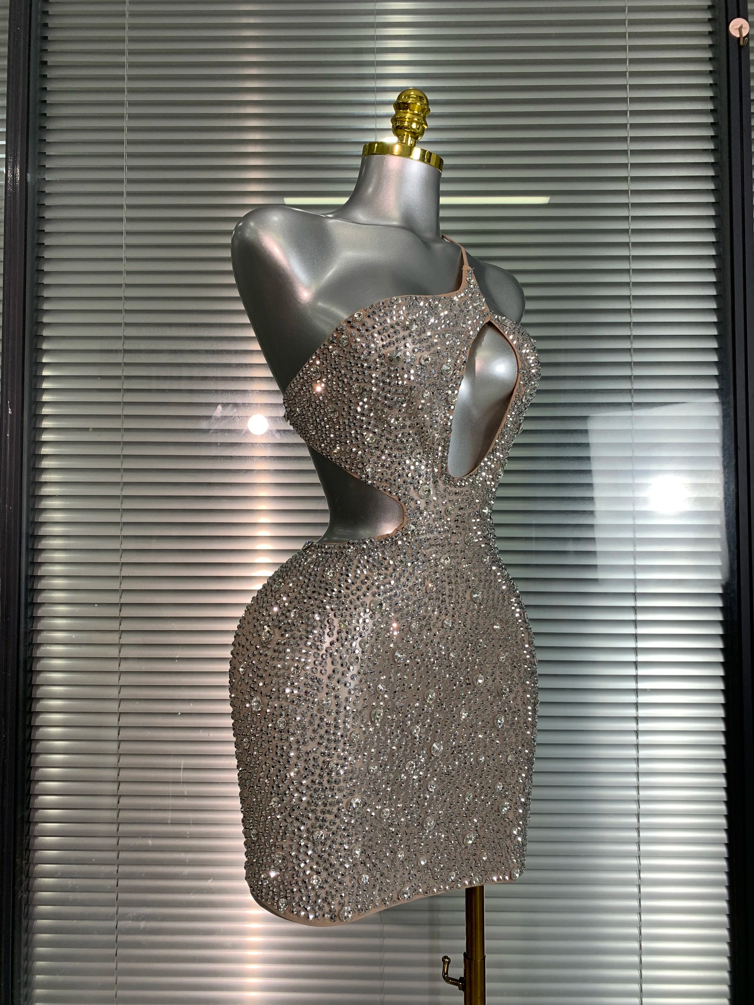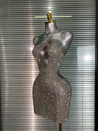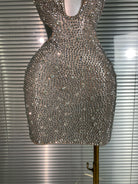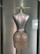 The Dance Floor Dreams Mini Dress dazzles with sparkling rhinestones and sequins, accentuating its bold hollow-out design. This mini dress is made to turn heads and light up every party, combining edgy allure with glamorous shine for a fearless night out.