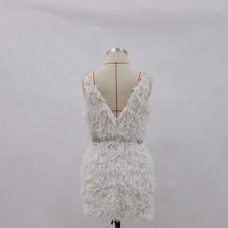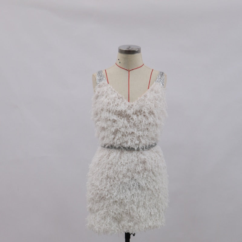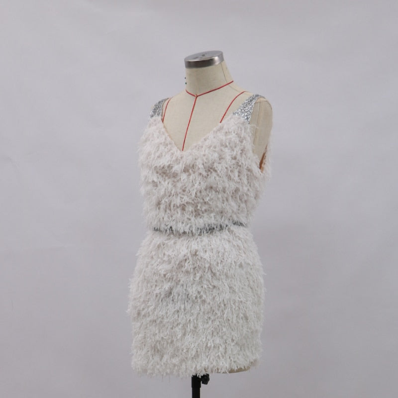 This stunning sleeveless dress is your go-to look for a party. Flattering and feminine, this dress is the perfect way to make a statement. A flattering v-neckline and feather decoration are sure to make you look best.