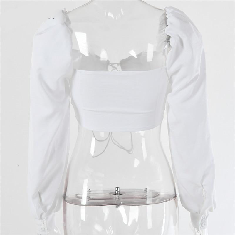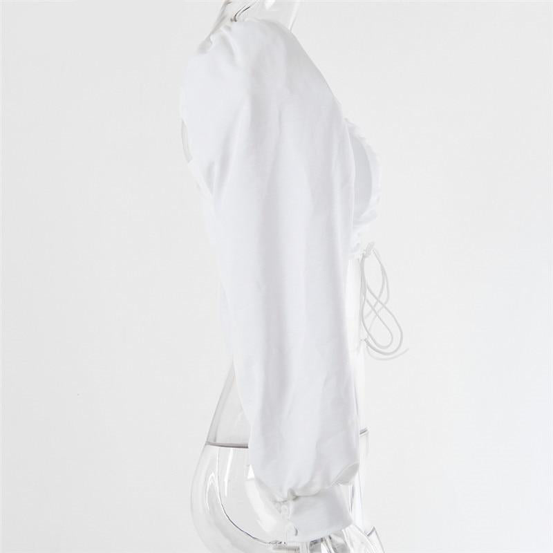 Broadcloth White Lace Up Hollow Out Puff Sleeve Women Crop Top