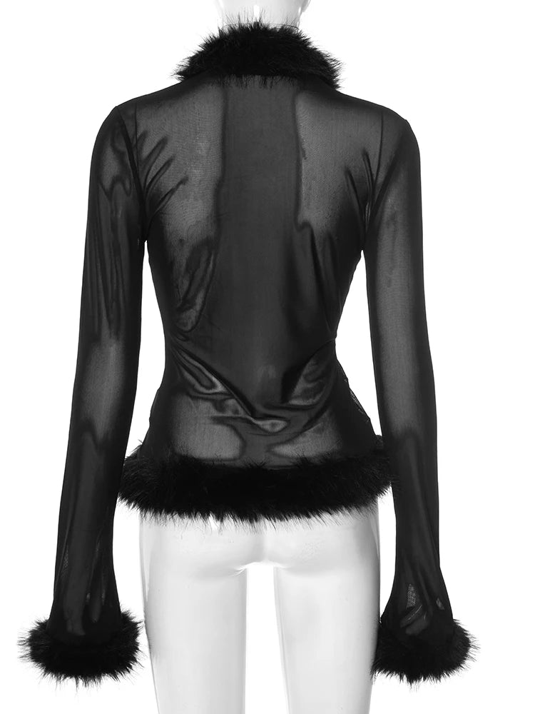 Feral But Feminine Top Unleash your wild side in this provocative black sheer top adorned with luxurious fur detailing. The delicate transparency paired with tactile fur creates an intoxicating contrast that's equal parts seduction and strength. Built for the woman who refuses to be tamed, this piece celebrates the power of embracing your primal nature without apology.