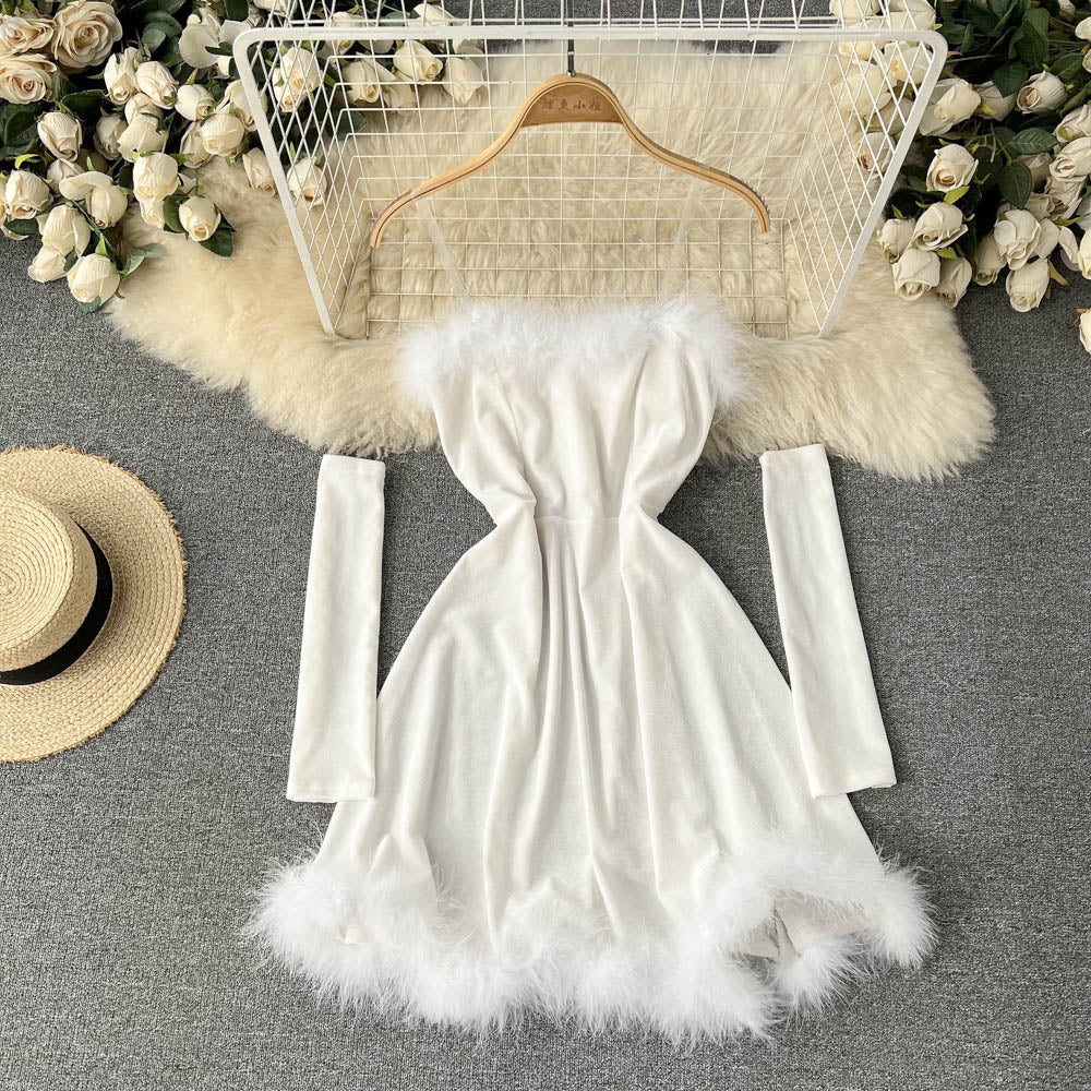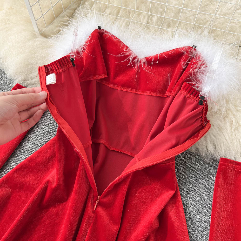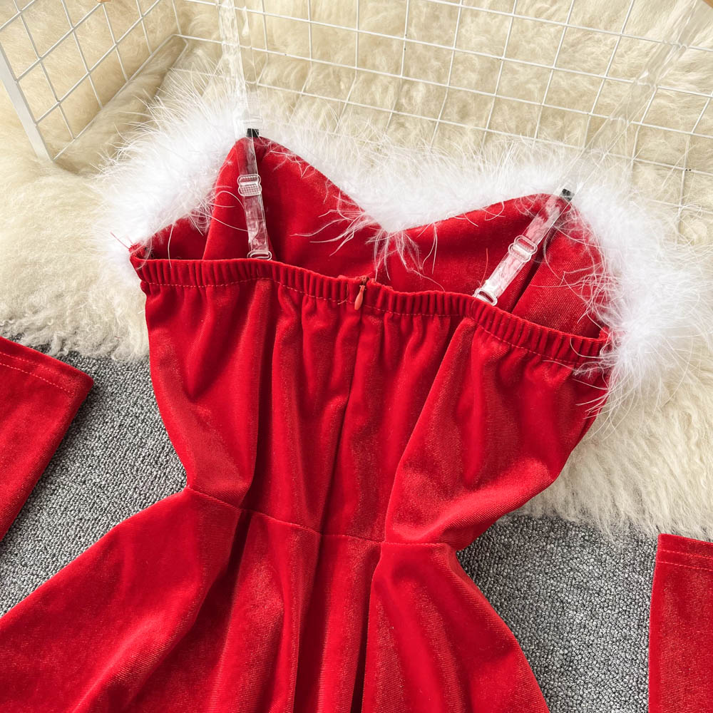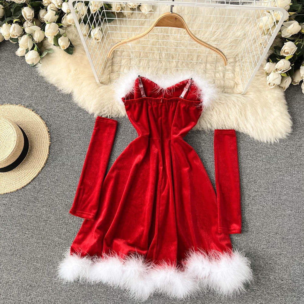 This mini dress has a transparent strap that makes it look like a strapless style. The white faux fur decoration adds a touch of cuteness. The closure is a zipper which makes it easy to take on and off. Feature an unattached sleeve so you can choose whether you want to wear it with a