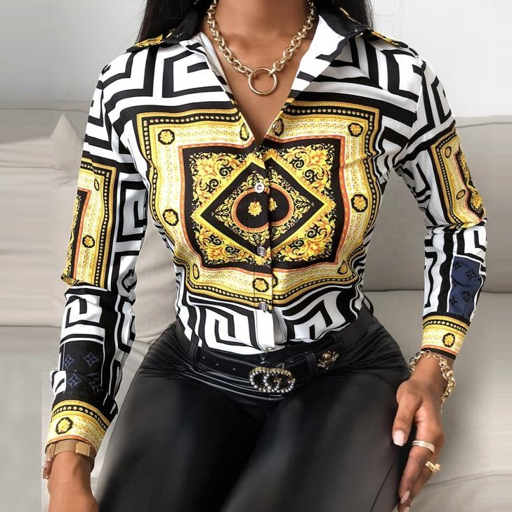 Geometric Patterned Shirt with Long-Sleeved and Turn Down Collar