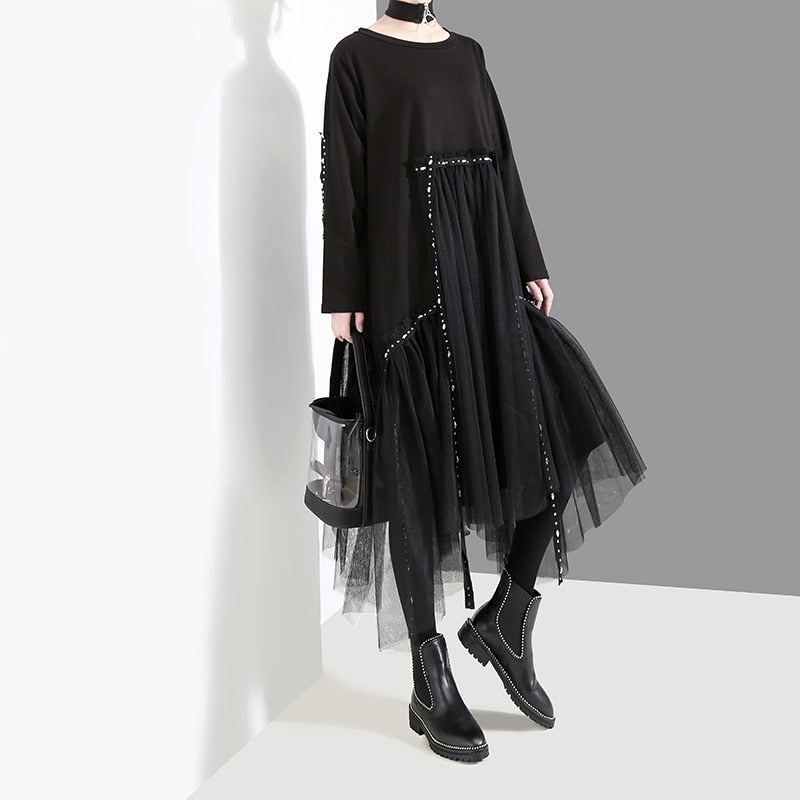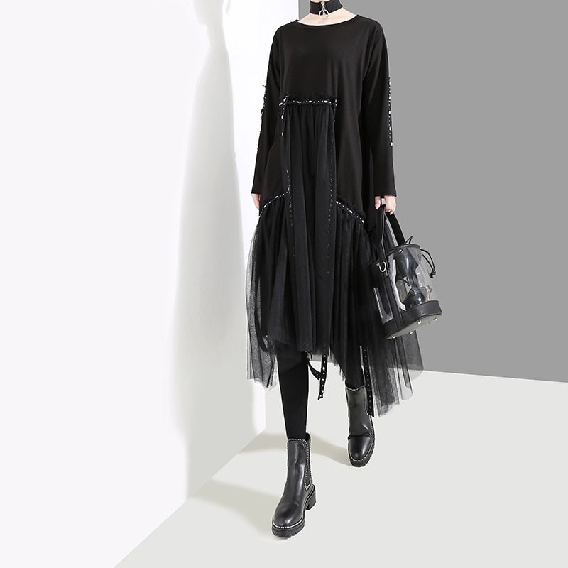 Mesh Acetate on Loose O-Neck Knee Lenght Midi Dress