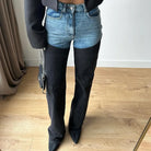 Command attention in these striking blue and black patchwork jeans that turn mixed materials into a bold artistic statement. The contrasting color blocking and irregular patches create visual intrigue and movement, refusing to blend into the background. High-waisted and unapologetically unconventional, these jeans celebrate individuality and creative expression.