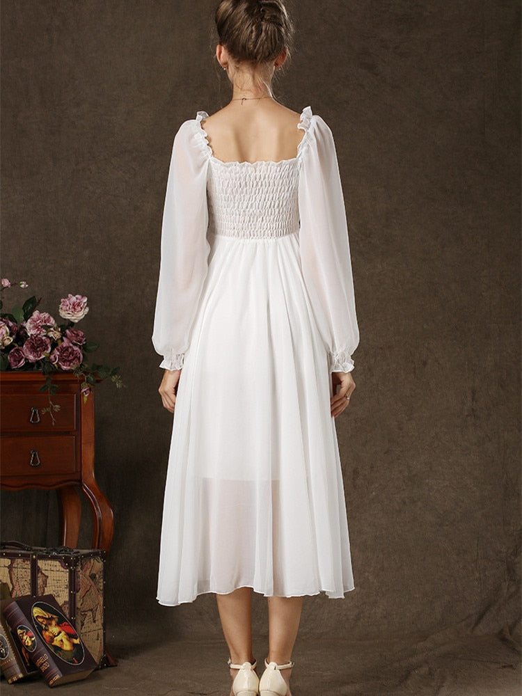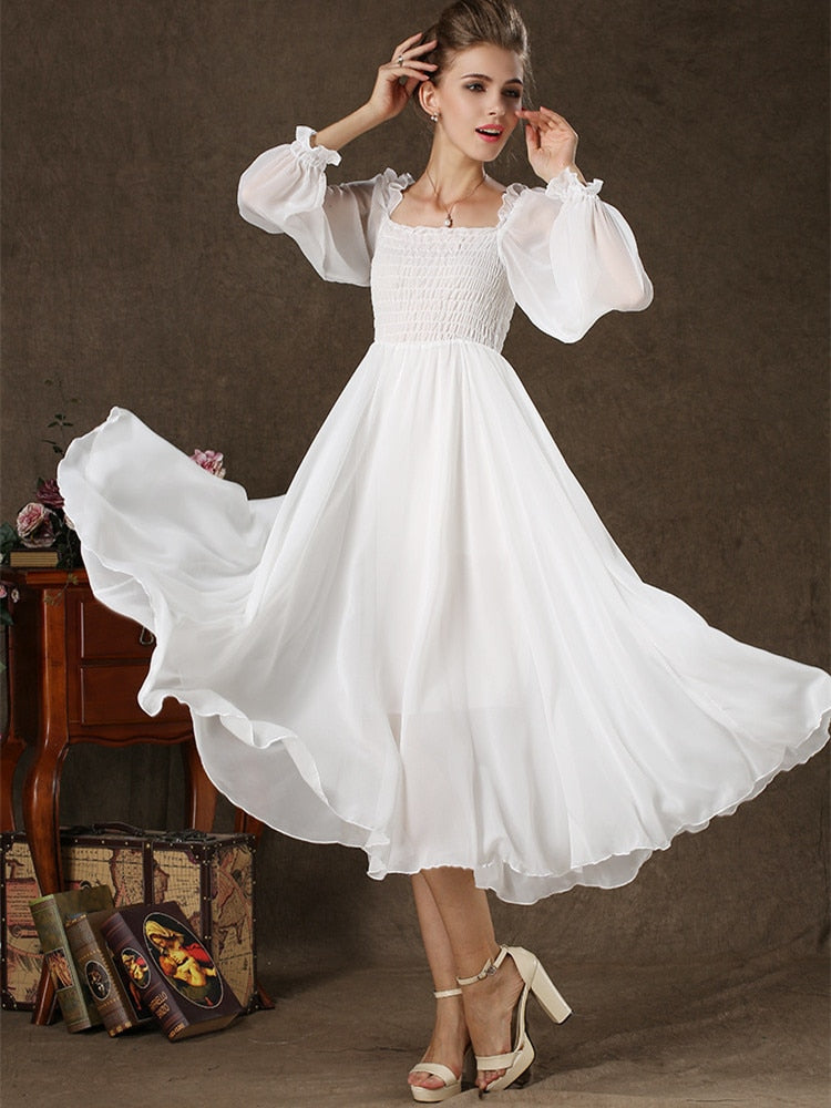 A beautiful white dress with lace and a square collar, this dress is perfect for any occasion. The full lantern sleeve lace detail and the chiffon material will make you feel beautiful and elegant. The one size will fit most women and the color is white.