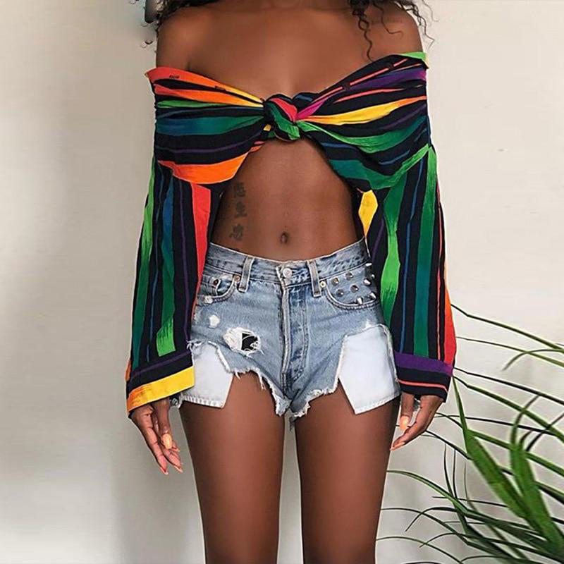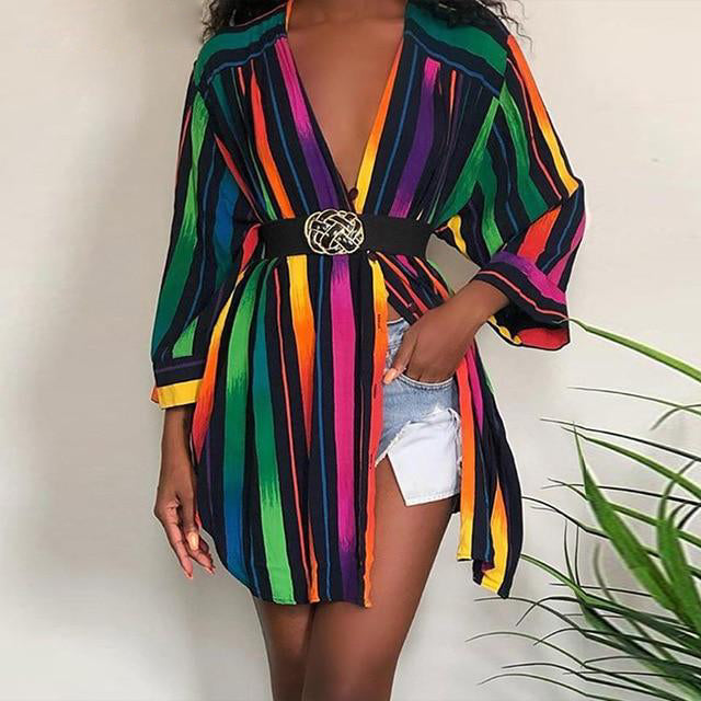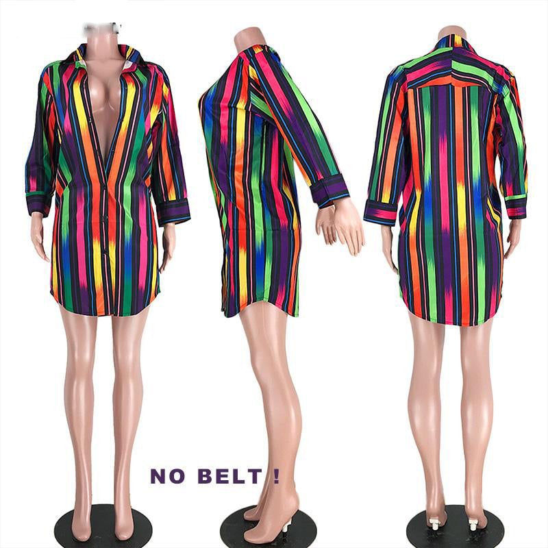 Casual Block Rainbow Color Collar Striped Sexy Turn Down Women Dress