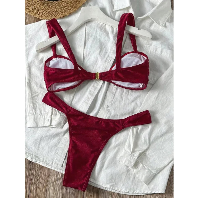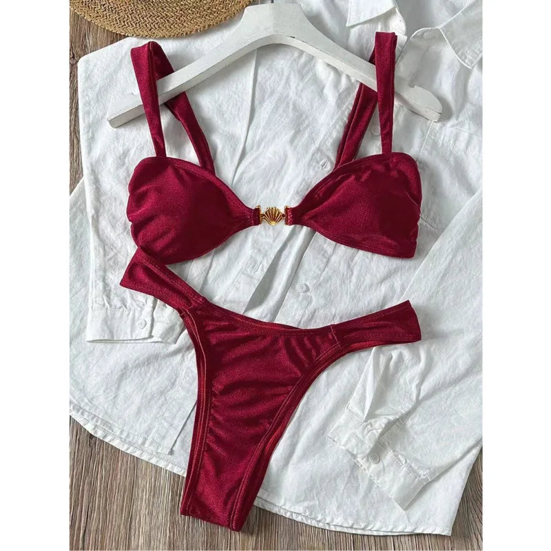 Elevate your beach style with this timeless bikini featuring elegant gold shell accents. The classic design combines comfort with sophistication, perfect for sun-soaked days by the water. Flattering cuts and quality construction ensure you'll feel confident and beautiful. Whether lounging poolside or catching waves, this versatile piece transitions seamlessly from beach to resort. The gold detailing adds a touch of luxury to your swimwear collection.