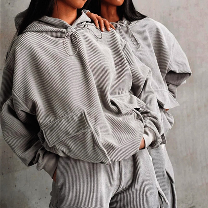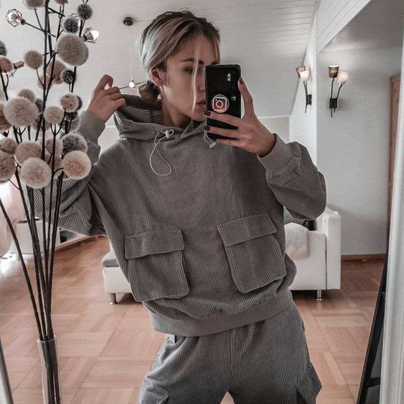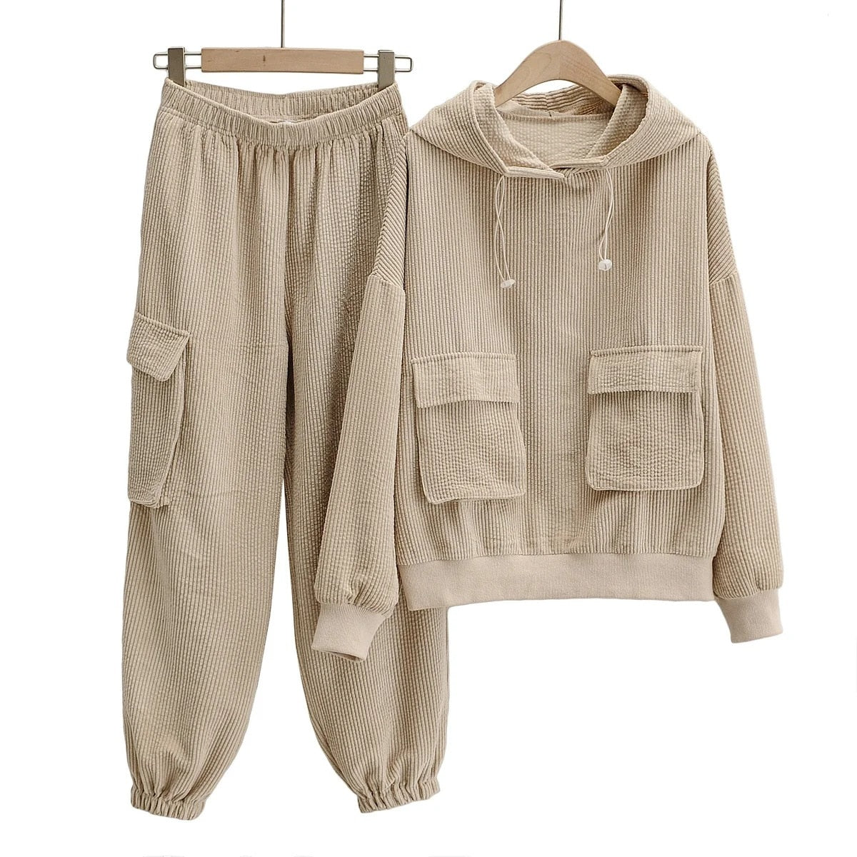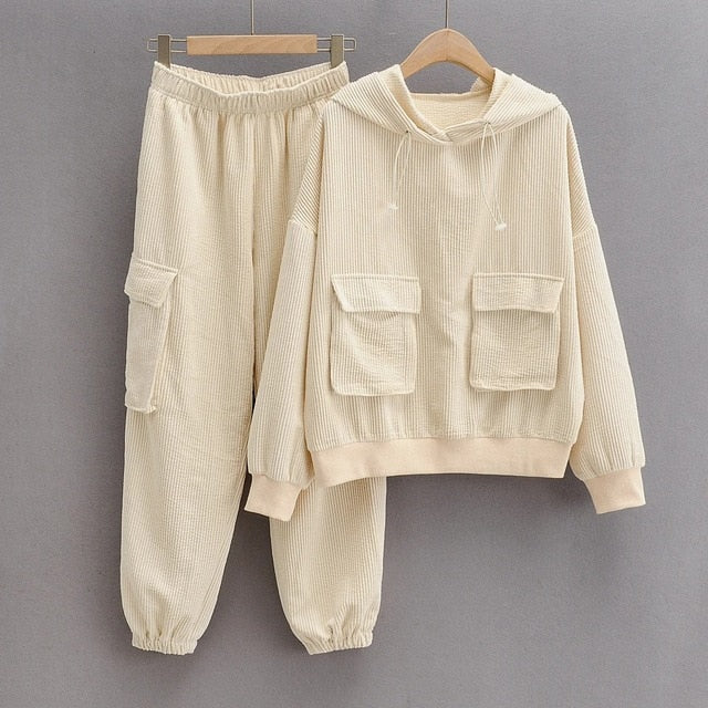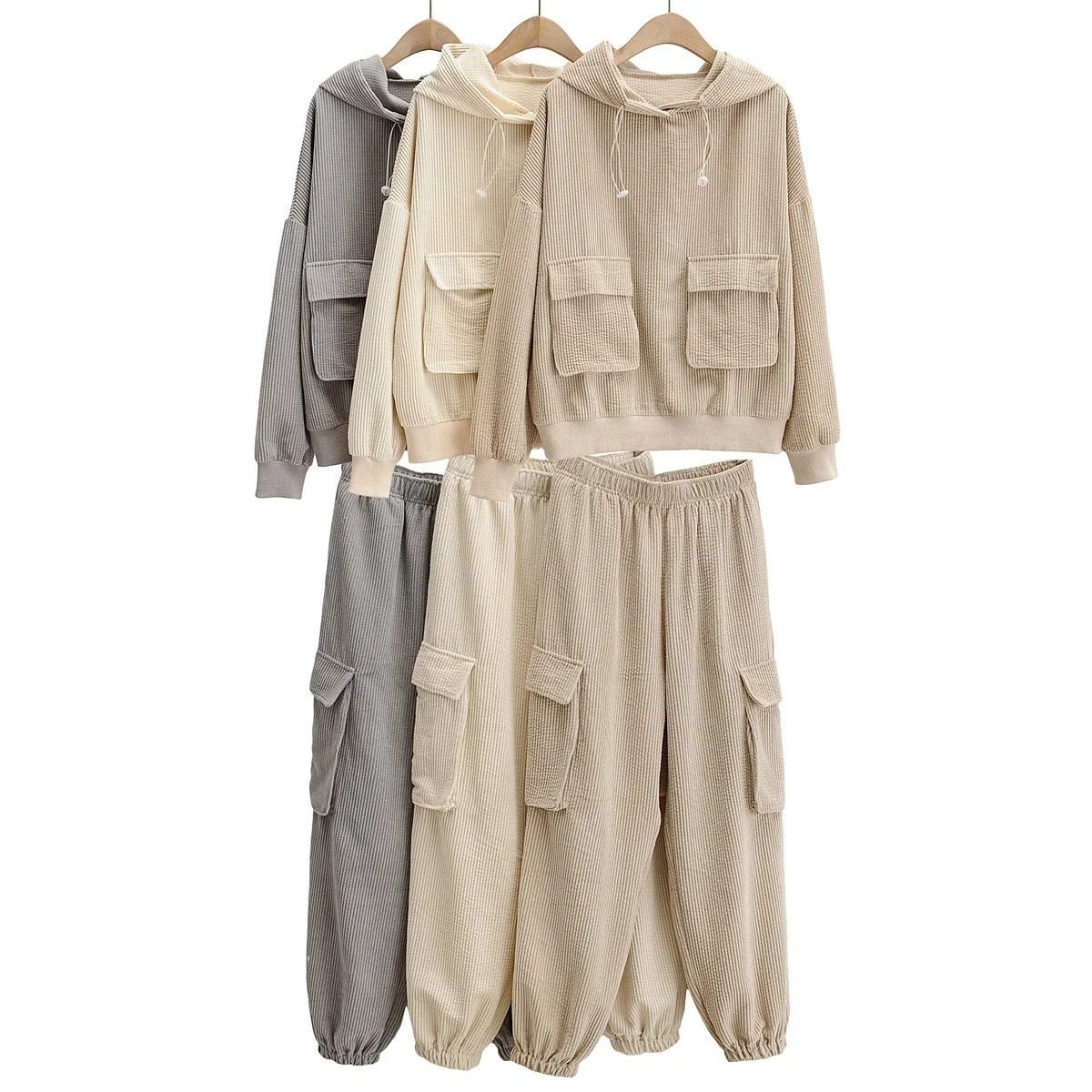 Solid Pattern Pant Sets With Pocket Decoration, Hoodie, And Cotton Material