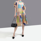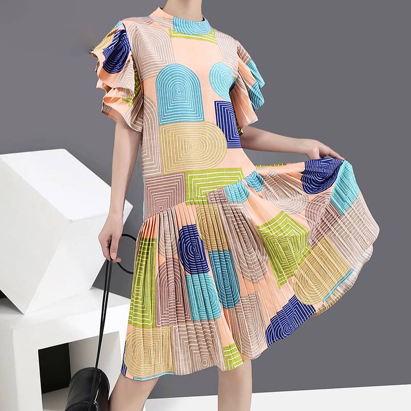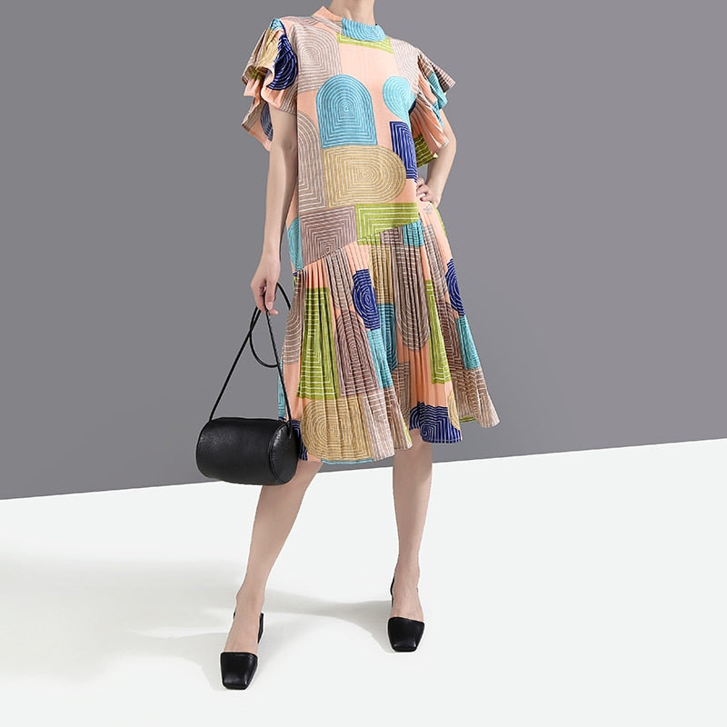Crew Neck Midi Dress with Geometric Print Pattern, Butterfly Sleeve, and Cotton Rayon Material