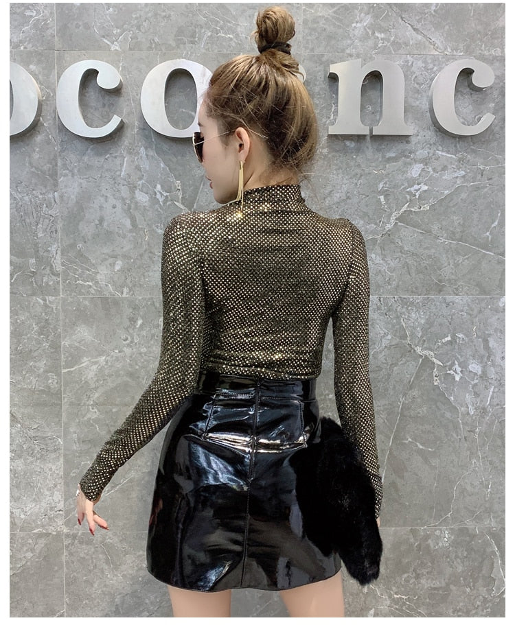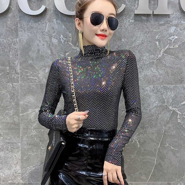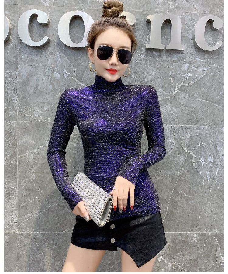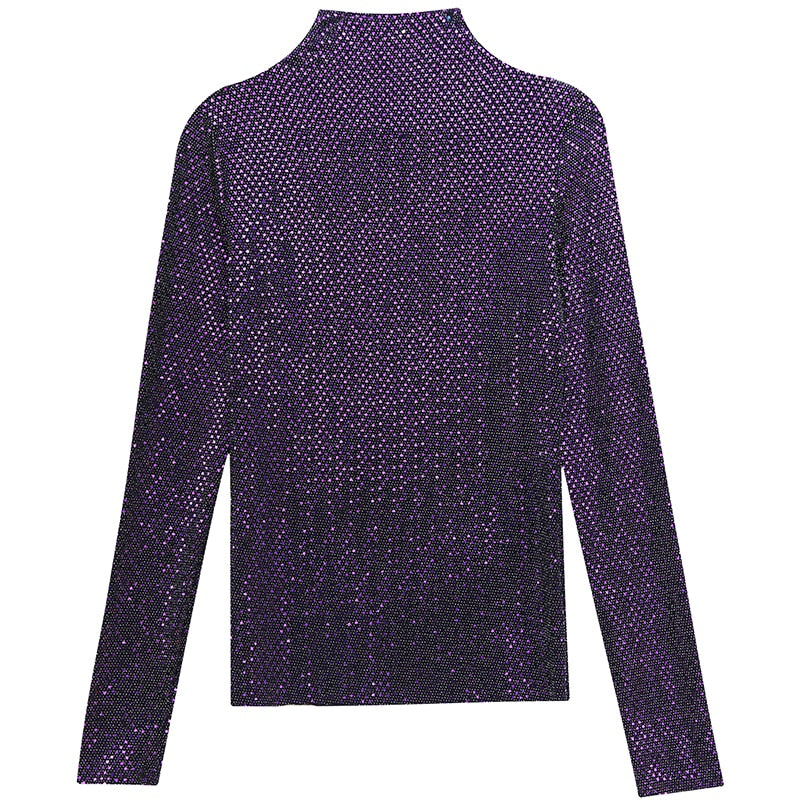 Turtleneck Collared Blouse with Sequin Decoration and Cotton Polyester Material