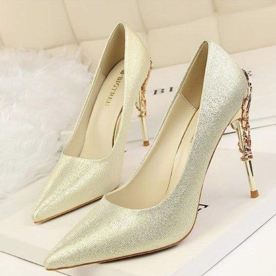 Dress up your favorite outfit with these shoes. The classic pump is a timeless staple in any woman's wardrobe. With a pointed toe and metal decorated heels, these shoes are perfect for a night out.