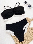 Make a statement in this eye-catching bandeau bikini featuring delicate frilled ruffles and a textured wrinkled finish. The strapless design offers a sleek, modern silhouette while the playful ruffle detailing adds dimension and movement. Perfect for beach days or poolside lounging, this two-piece combines comfort with contemporary style.