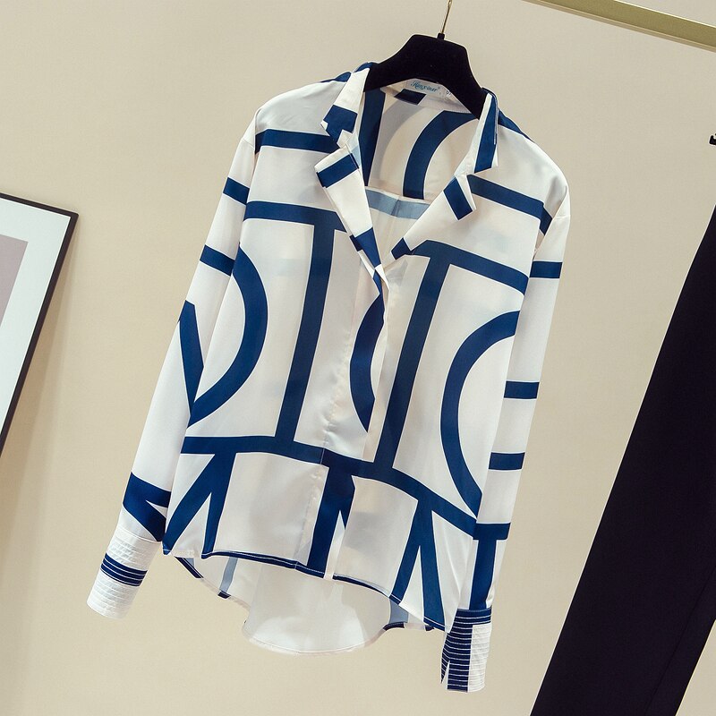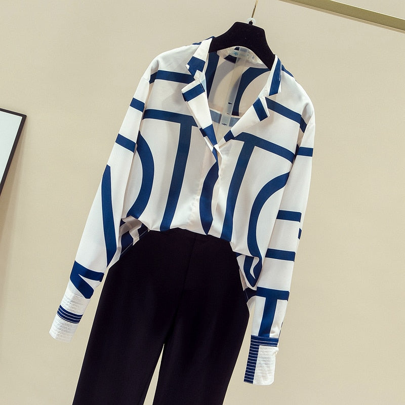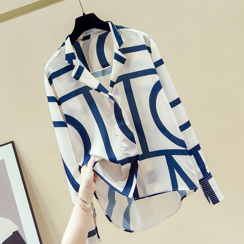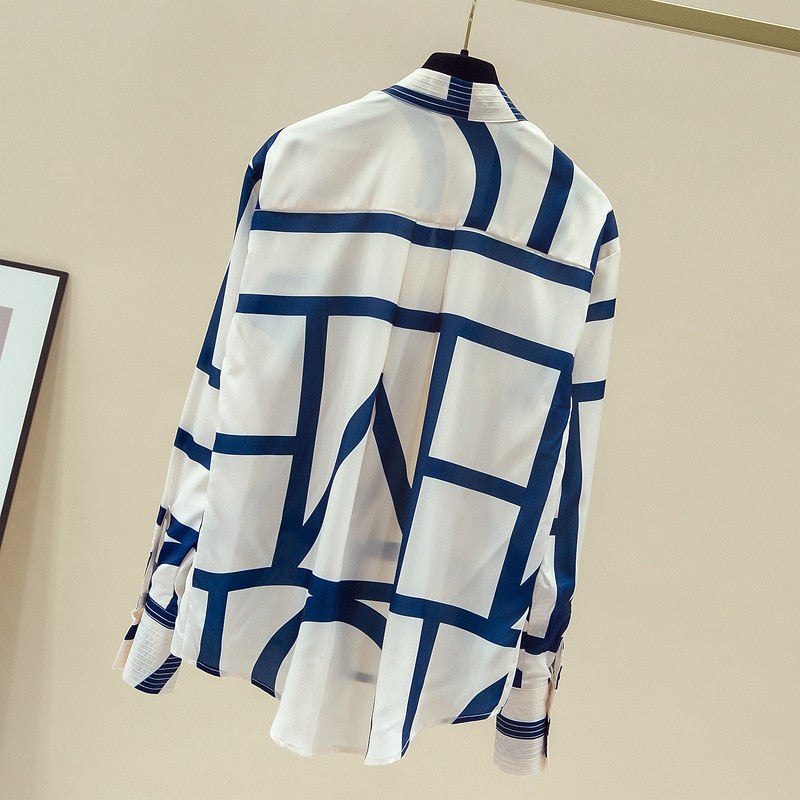 Long-Sleeved Polyester Silk Shirt with Stripe Geometric Pattern