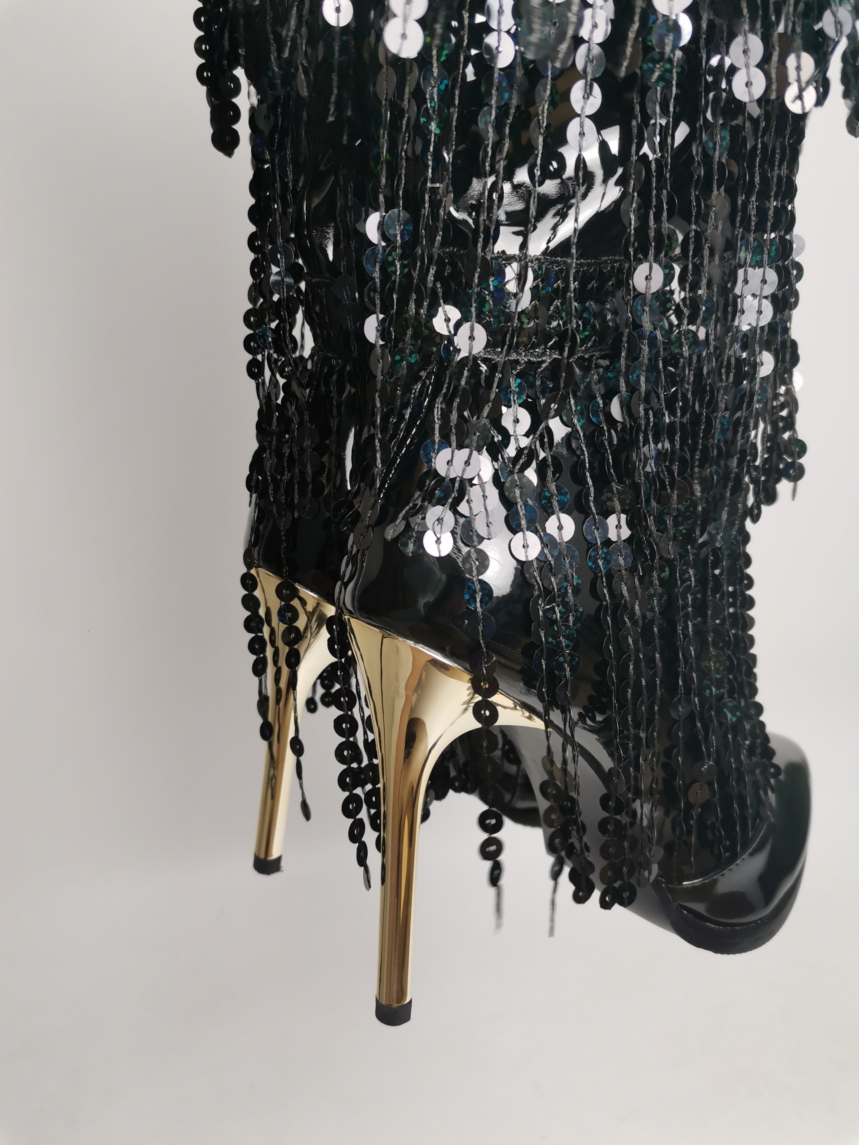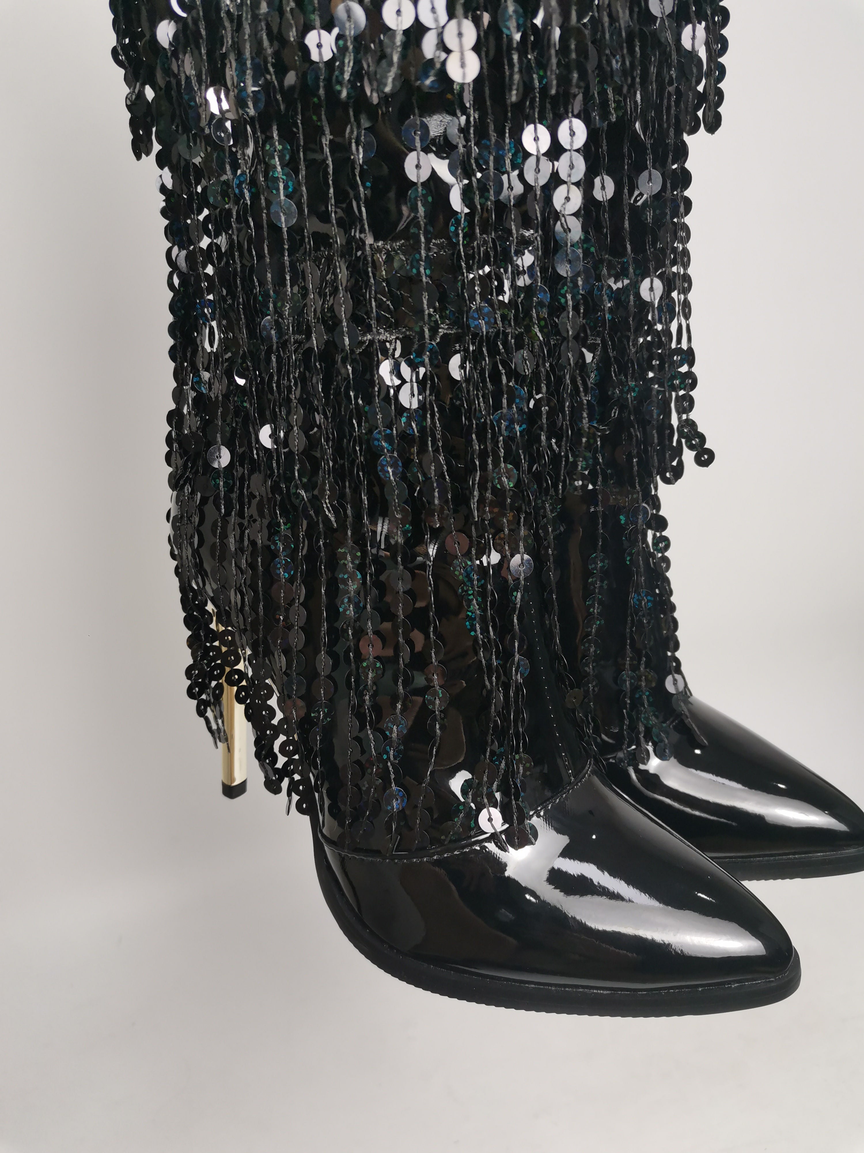 These cute and elegant knee-high boots are perfect for the warmer months. They feature a trendy metallic glitter design over a sturdy microfiber upper. These boots are perfect for the season with their stylish and comfortable fit. These boots are a great option for everyday wear.