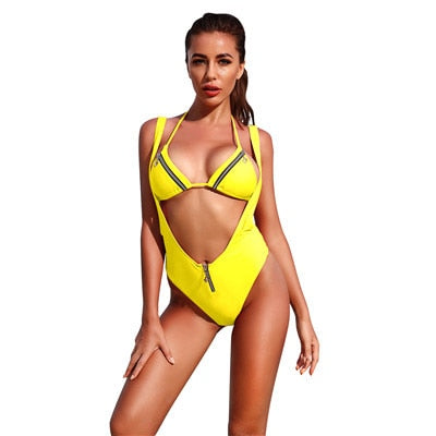 Solid Two-Piece Bikini with Zipper Decoration and Nylon Material