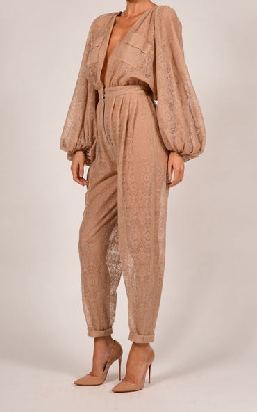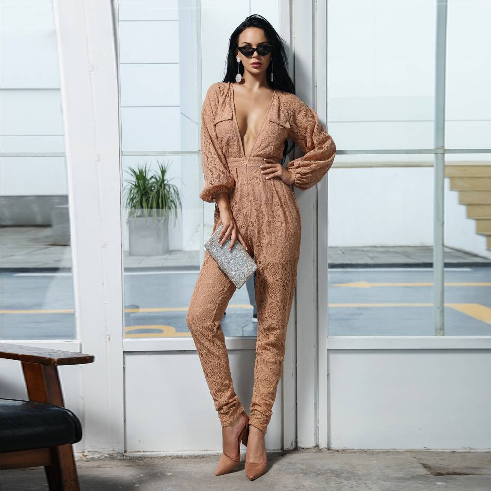 Polyester Solid With Lace Decoration Bishop Sleeve Jumpsuit