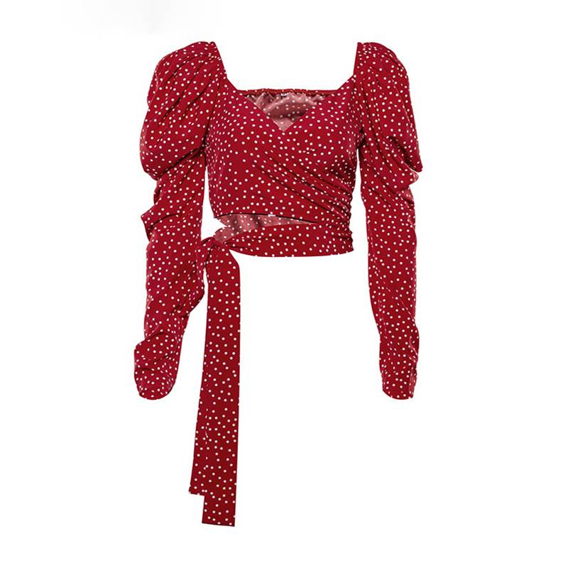 Polka Dot Patterned Blouse with Long Sleeve and Ribbon Decoration
