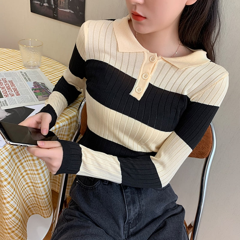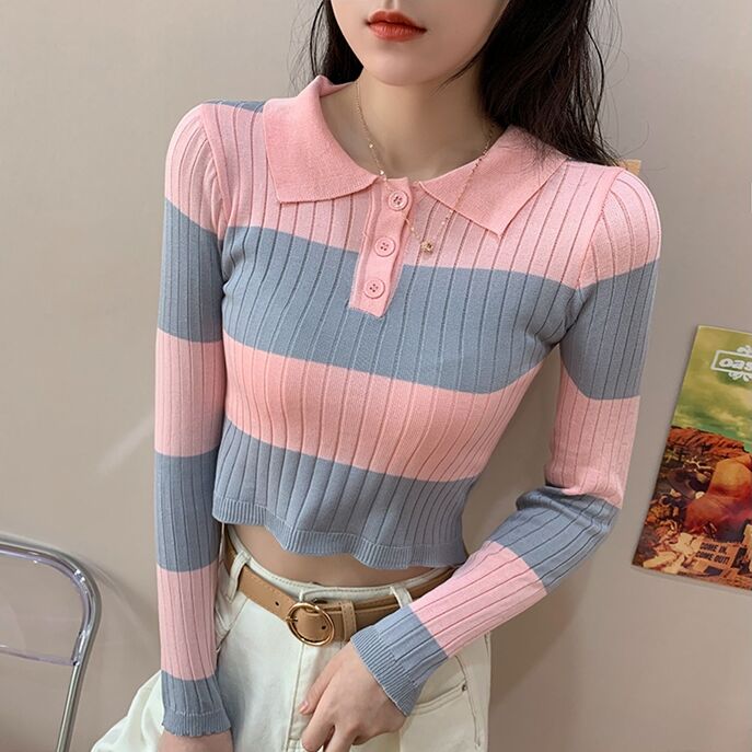 Long Sleeve Striped Shirt With Turn-Down Collar, Short Length Type, And Polyester Viscose Material