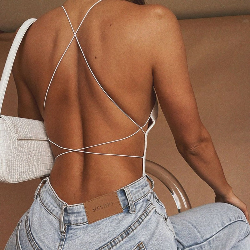 Backless Sleeveless Bodysuit in Solid Color with Halter Spaghetti Strap and Made From Cotton Material